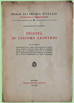 | Note: | Discorso tenuto nell'Aula Magna dell'Ateneo di Napoli, nella solenne adunanza della Reale Accademia d'Italia del 22 febbraio 1939-XVII in occasione della traslazione dei resti mortali di Leopardi da S. Vitale Fuorigrotta al Parco Virgiliano. |