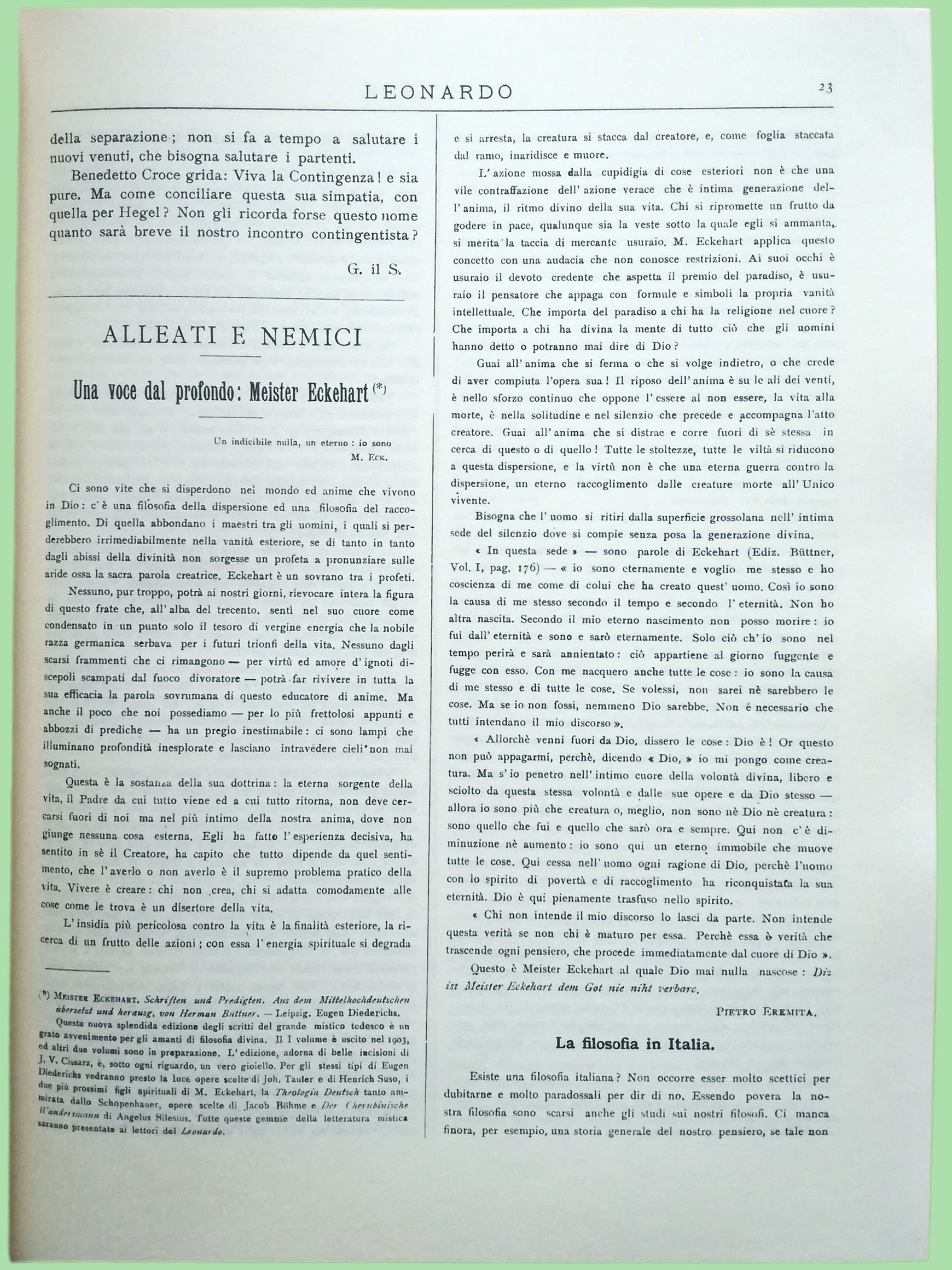 Tesi facile, dunque, ma non inutile a riprendersi, magari per augurare e per tentare che le cose si volgano al meglio e che si possa creare in Italia un movimento che abbia caratteri propri, tendenze nuove, ardore speculativo e abbia vita meno ufficiale del dottrinarismo esanime delle RR. Università.