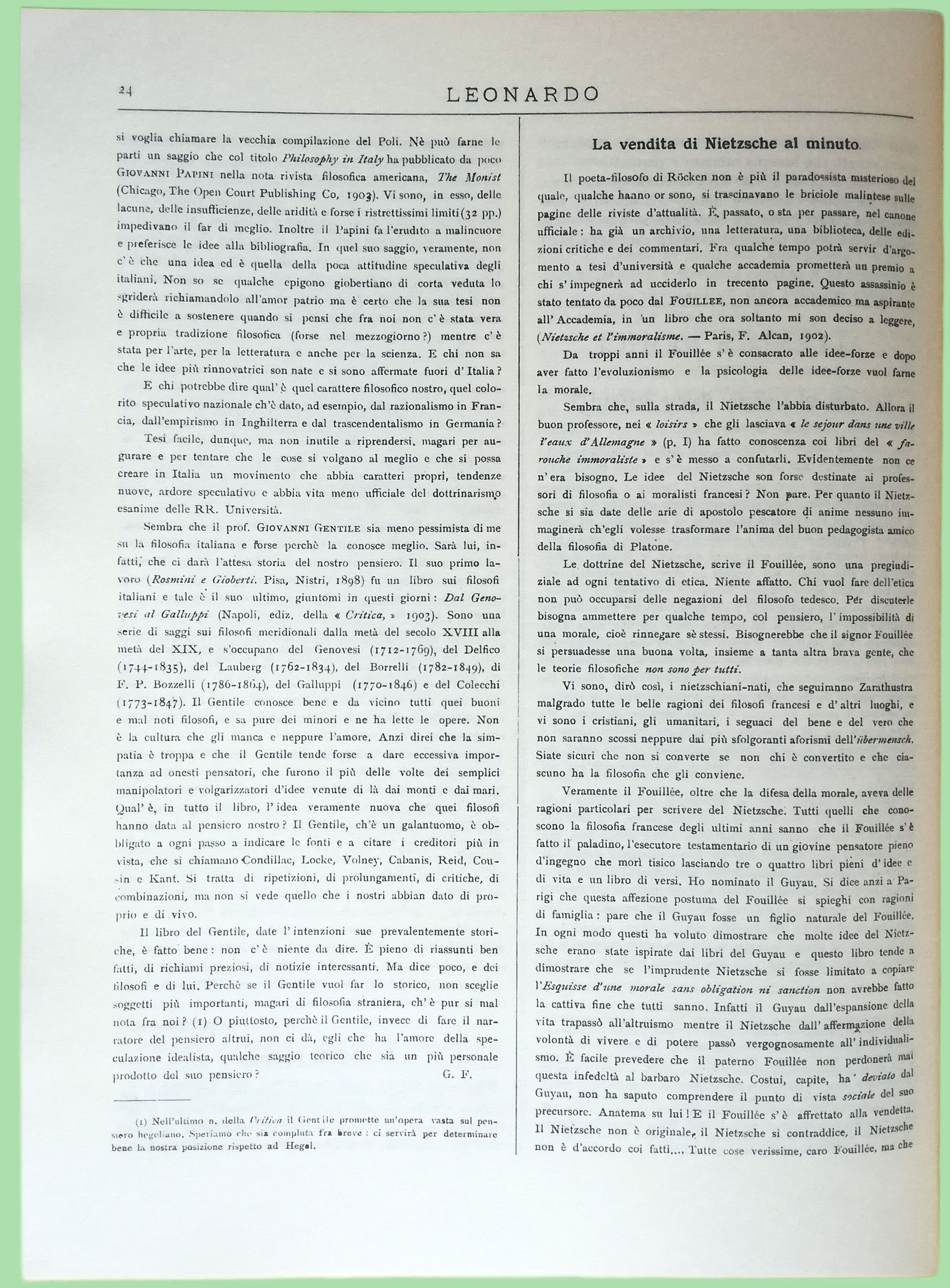Il libro del Gentile, date l'intenzioni sue prevalentemente storiche, è fatto bene: non c'è niente da dire. È pieno di riassunti ben fatti, di richiami preziosi, di notizie interessanti. Ma dice poco, e dei filosofi e di lui. Perchè se il Gentile vuol far lo storico, non sceglie soggetti più importanti, magari di filosofia straniera, ch'è pur si mal nota fra noi? 1 O piuttosto, perchè il Gentile, invece di fare il narratore del pensiero altrui, non ci dà, egli che ha l'amore della speculazione idealista, qualche saggio teorico che sia un più personale prodotto del suo pensiero?