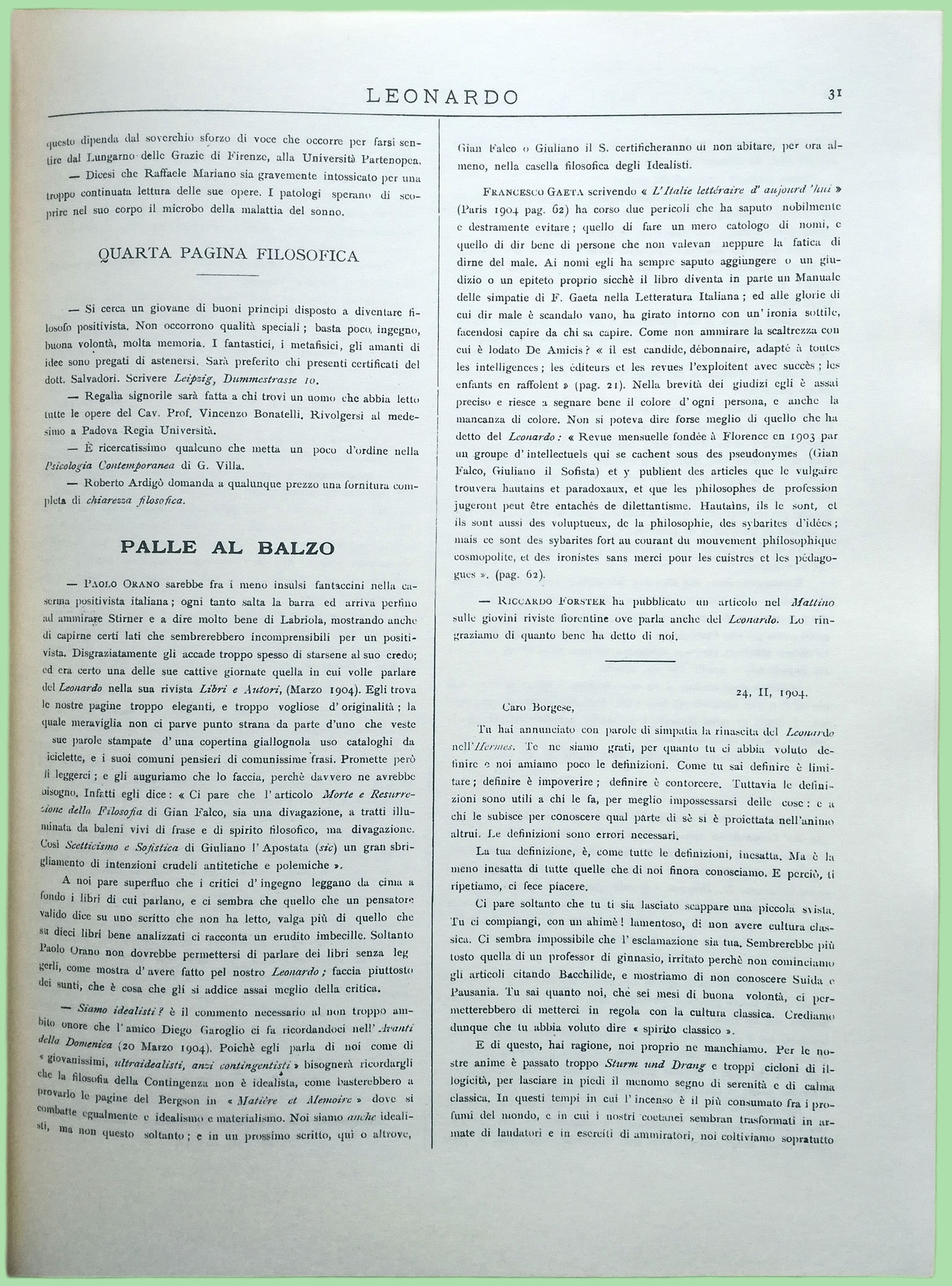 — Un lettore della Rivista Italiana di Filosofia ne ha letto un numero intero senza addormentarsi. È la prima volta che un fatto di tal genere vien consegnato negli annali filosofici.
