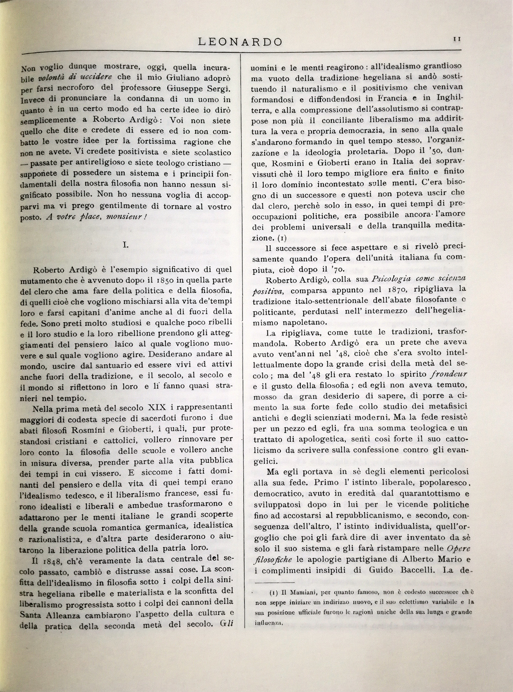 Non voglio dunque mostrare, oggi, quella incurabile volontà di uccidere che il mio Giuliano adoprò per farsi necroforo del professore Giuseppe Sergi. Invece di pronunciare la condanna di un uomo in quanto è in un certo modo ed ha certe idee io dirò semplicemente a Roberto Ardigò: Voi non siete quello che dite e credete di essere ed io non combatto le vostre idee per la fortissima ragione che non ne avete. Vi credete positivista e siete scolastico — passate per antireligioso e siete teologo cristiano —supponete di possedere un sistema e i principii fondamentali della nostra filosofia non hanno nessun significato possibile. Non ho nessuna voglia di accopparvi ma vi prego gentilmente di tornare al vostro posto. A votre place, monsieur!