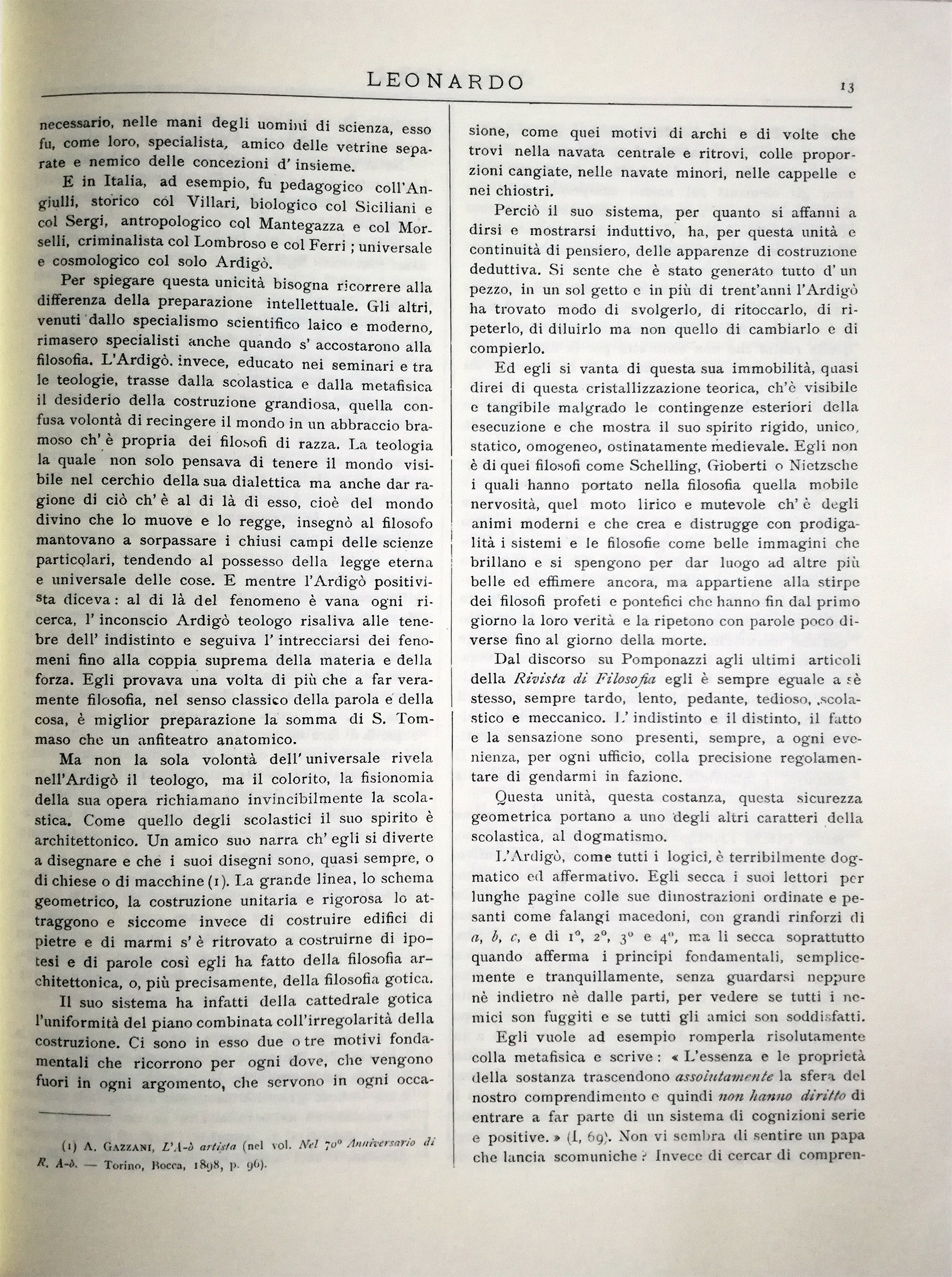 Ma non la sola volontà dell'universale rivela nell'Ardigò il teologo, ma il colorito, la fisionomia della sua opera richiamano invincibilmente la scolastica. Come quello degli scolastici il suo spirito è architettonico. Un amico suo narra ch'egli si diverte a disegnare e che i suoi disegni sono, quasi sempre, o di chiese o di macchine 3. La grande linea, lo schema geometrico, la costruzione unitaria e rigorosa lo attraggono e siccome invece di costruire edifici di pietre e di marmi s'è ritrovato a costruirne di ipotesi e di parole così egli ha fatto della filosofia architettonica, o, più precisamente, della filosofia gotica.