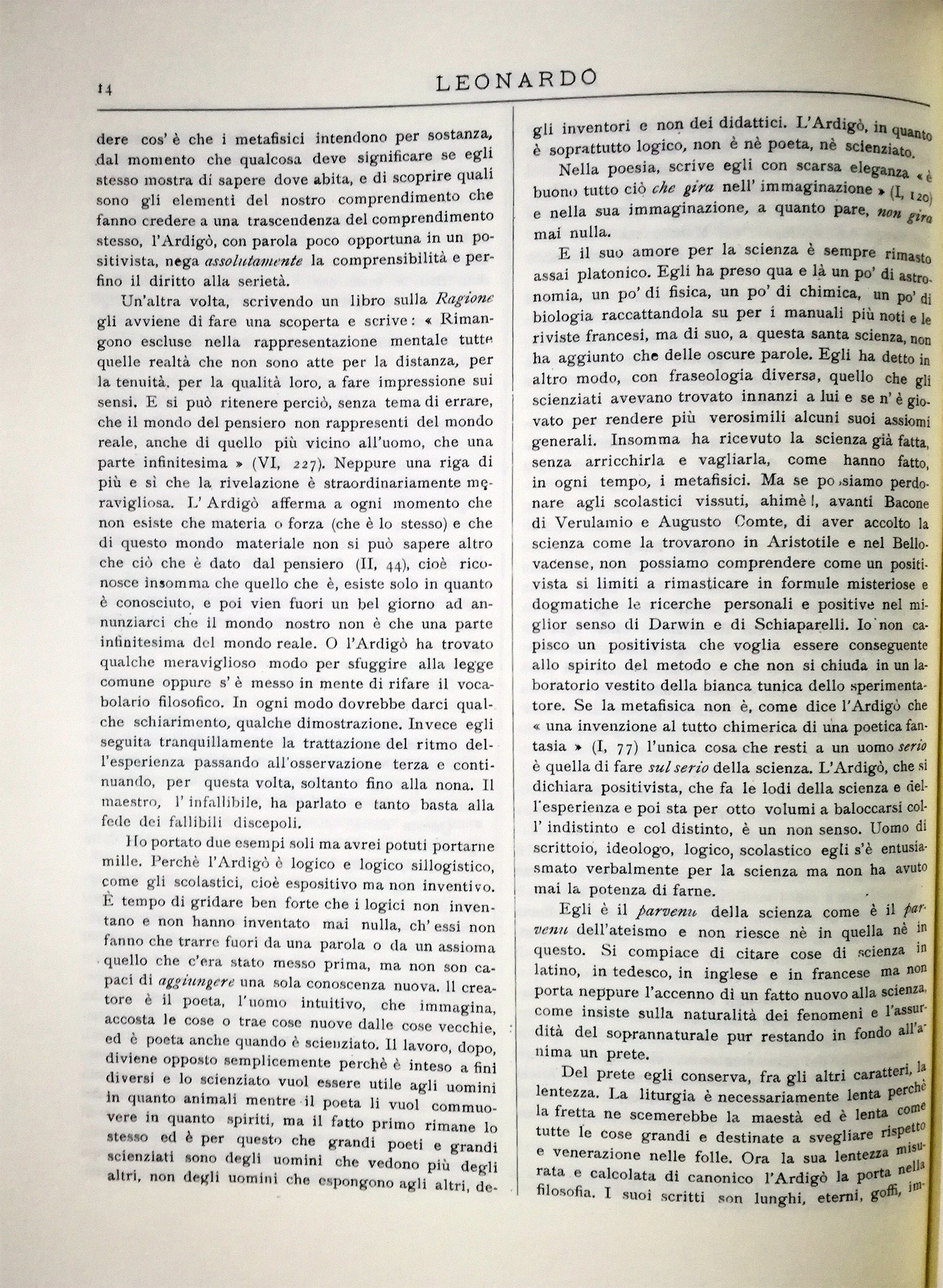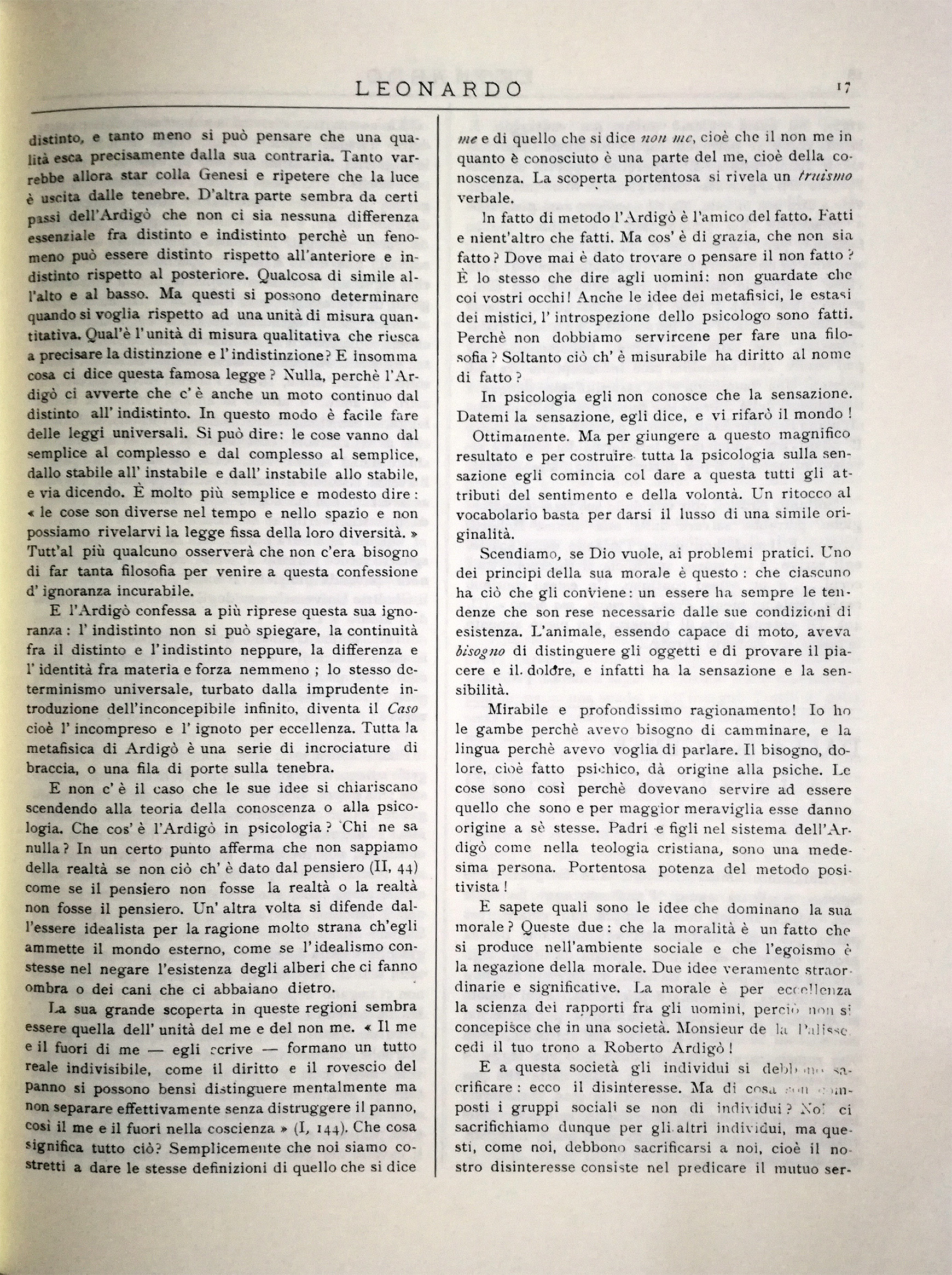 L'Ardigò, come tutti i logici, è terribilmente dogmatico ed affermativo. Egli secca i suoi lettori per lunghe pagine colle sue dimostrazioni ordinate e pesanti come falangi macedoni, con grandi rinforzi di a, b, c, e di 1°, 2°, 3° e 4°, ma li secca soprattutto quando afferma i principi fondamentali, semplicemente e tranquillamente, senza guardarsi neppure nè indietro nè dalle parti, per vedere se tutti i nemici son fuggiti e se tutti gli amici son soddisfatti.