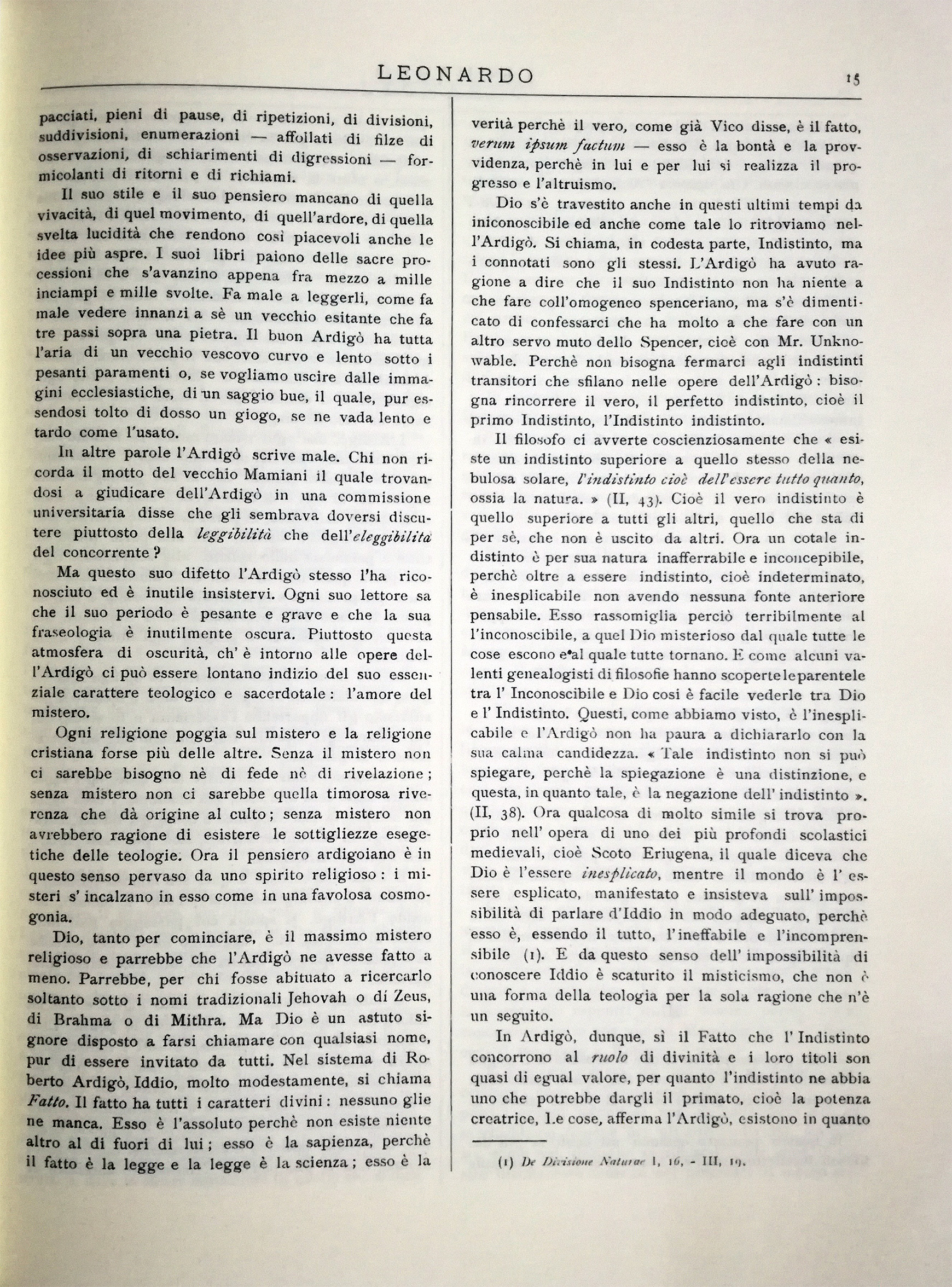 In altre parole l'Ardigò scrive male. Chi non ricorda il motto del vecchio Mamiani il quale trovandosi a giudicare dell'Ardigò in una commissione universitaria disse che gli sembrava doversi discutere piuttosto della leggibilità che dell'eleggibilità del concorrente? Ma questo suo difetto l'Ardigò stesso l'ha riconosciuto ed è inutile insistervi. Ogni suo lettore sa che il suo periodo è pesante e grave e che la sua fraseologia è inutilmente oscura. Piuttosto questa atmosfera di oscurità, ch'è intorno alle opere dell'Ardigò ci può essere lontano indizio del suo essenziale carattere teologico e sacerdotale: l'amore del mistero.