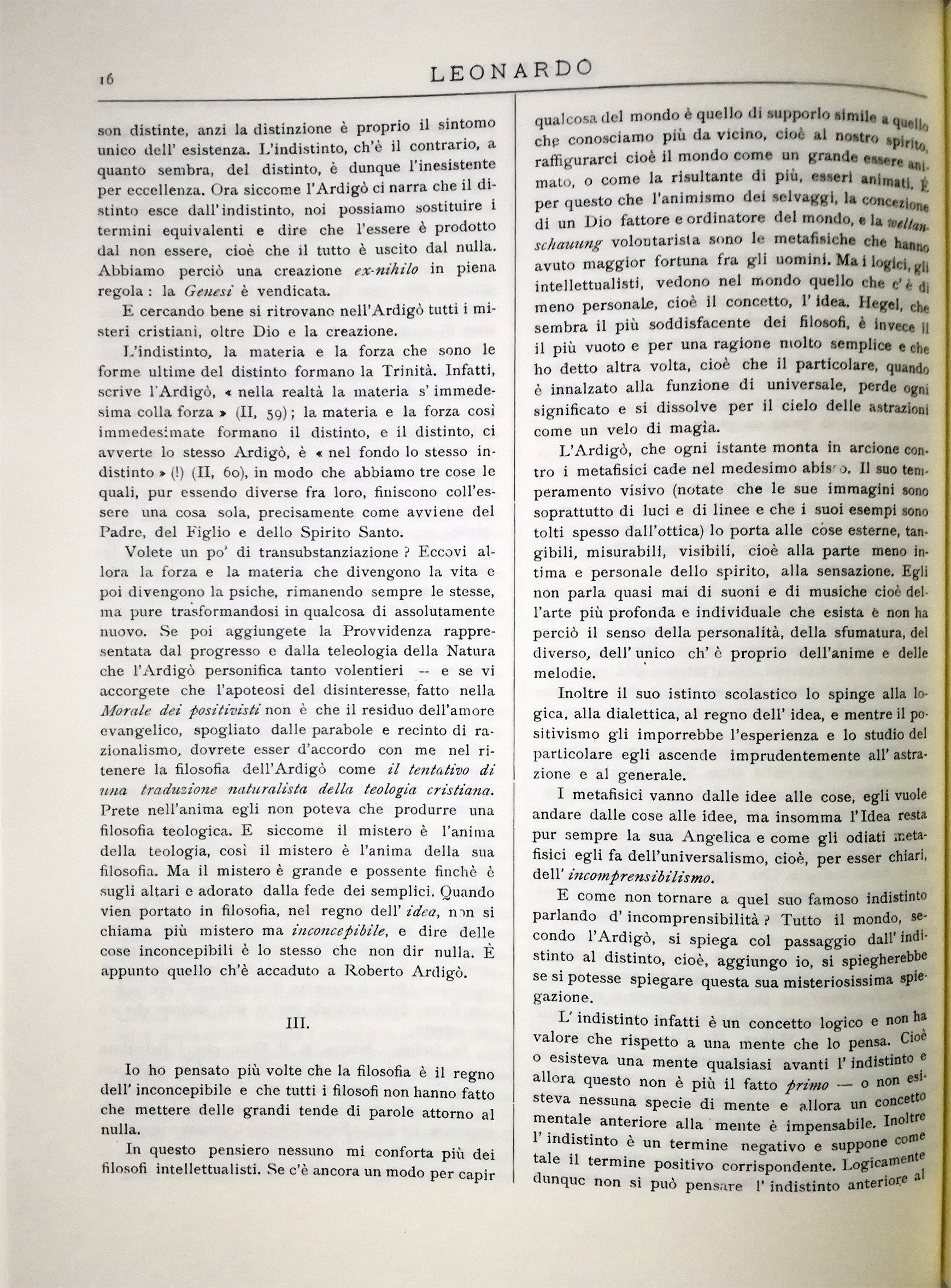 Volete un po' di transubstanziazione? Eccovi allora la forza e la materia che divengono la vita poi divengono la psiche, rimanendo sempre le stesse, ma pure trasformandosi in qualcosa di assolutamente nuovo. Se poi aggiungete la Provvidenza rappresentata dal progresso e dalla teleologia della Natura che l'Ardigò personifica tanto volentieri — e se vi accorgete che l'apoteosi del disinteresse, fatto nella Morale dei positivisti non è che il residuo dell'amore evangelico, spogliato dalle parabole e recinto di razionalismo, dovrete esser d'accordo con me nel ritenere la filosofia dell'Ardigò come il tentativo di una traduzione naturalista della teologia cristiana.