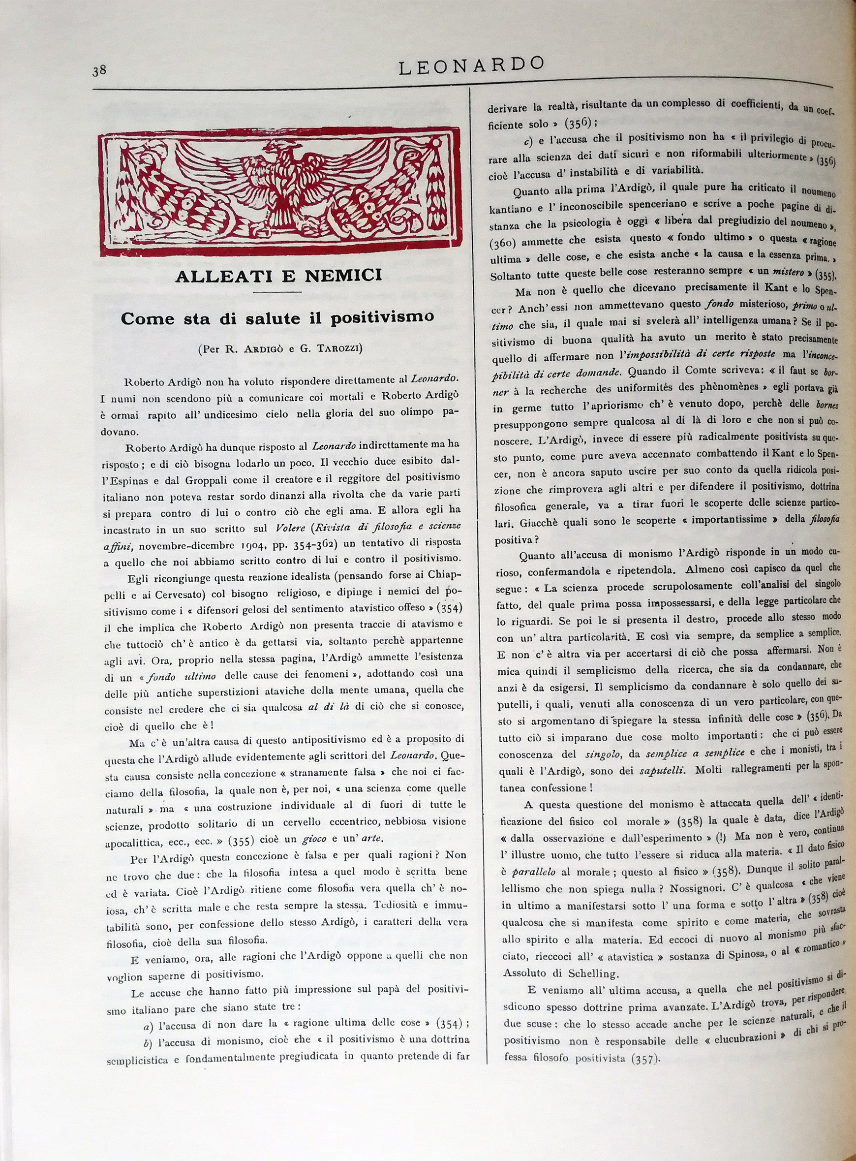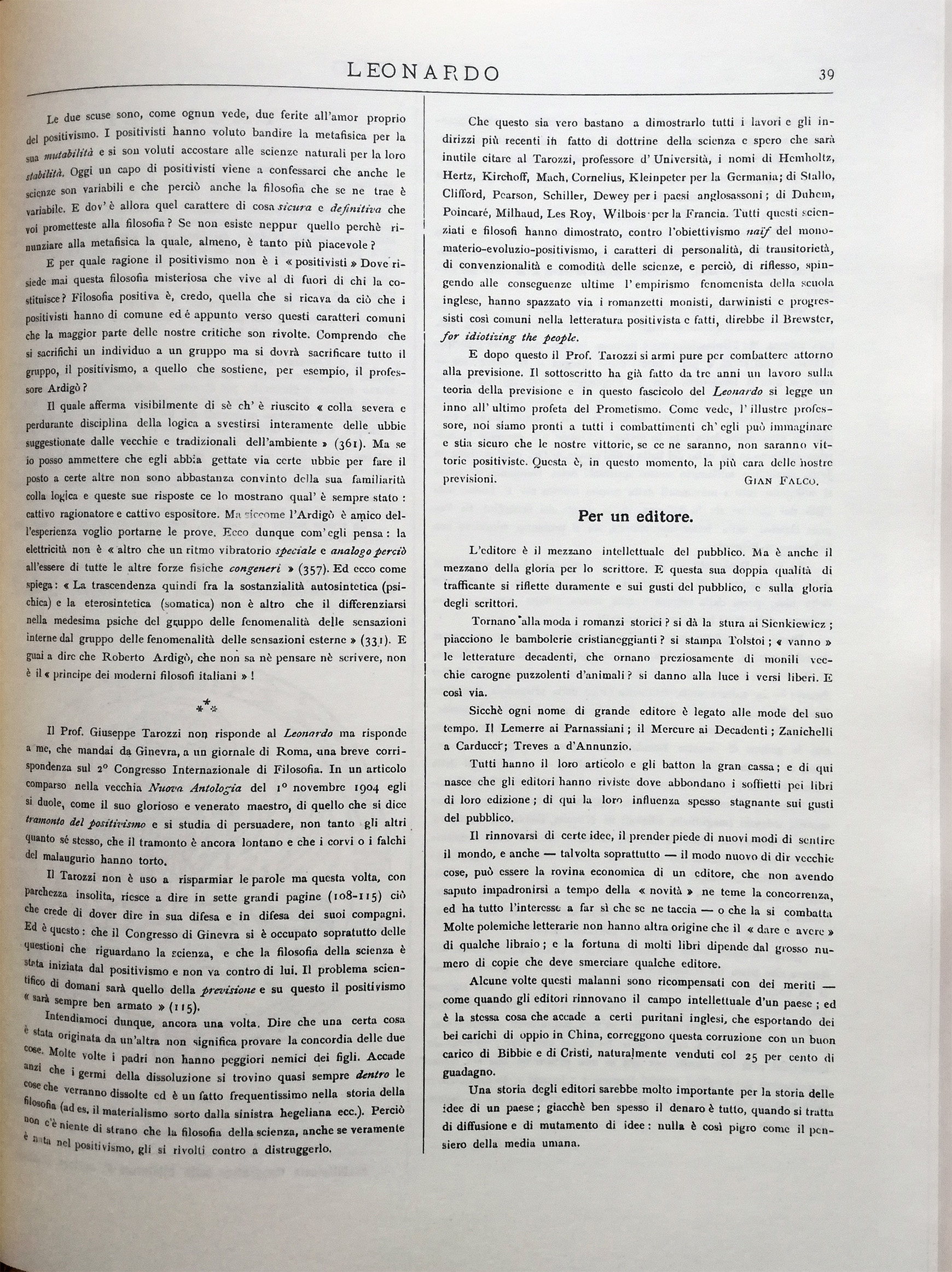 Il Prof. Giuseppe Tarozzi non risponde al Leonardo ma risponde a me, che mandai da Ginevra, a un giornale di Roma, una breve corrispondenza sul 2° Congresso Internazionale di Filosofia. In un articolo comparso nella vecchia Nuova Antologia del 1° novembre 1904 egli si duole, come il suo glorioso e venerato maestro, di quello che si dice tramonto del positivismo e si studia di persuadere, non tanto gli altri quanto sé stesso, che il tramonto è ancora lontano e che i corvi o i falchi del malaugurio hanno torto.