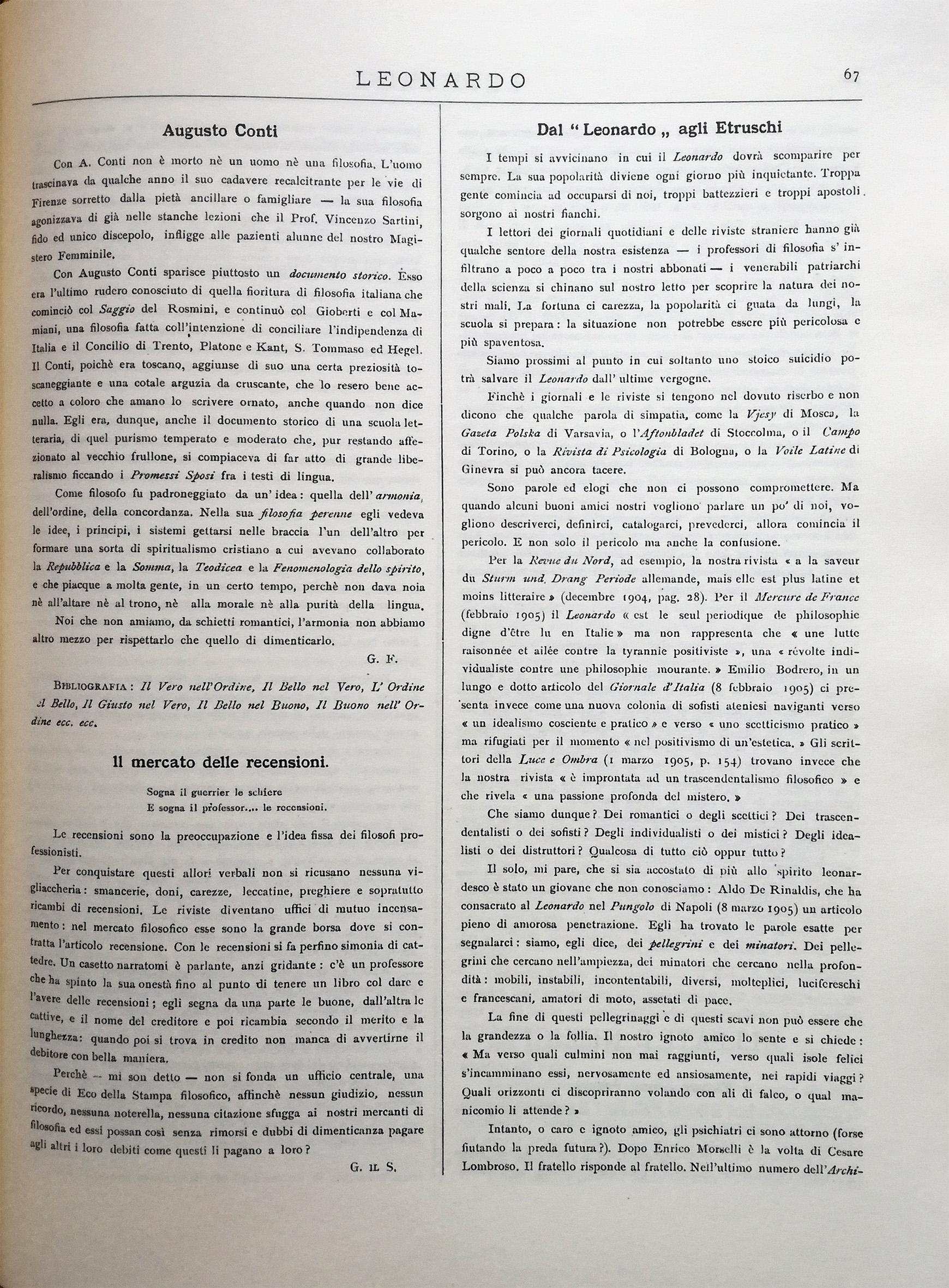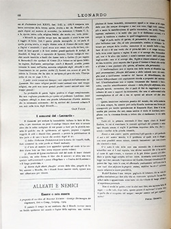 Siamo prossimi al punto in cui soltanto uno stoico suicidio potrà salvare il Leonardo dall'ultime vergogne. Finchè i giornali e le riviste si tengono nel dovuto riserbo e non dicono che qualche parola di simpatia, come la Vjesy di Mosca, la Gazeta Polska di Varsavia, o l'Aftonbladet di Stoccolma, o il Campo di Torino, o la Rivista di Psicologia di Bologna, o la Voile Latine di Ginevra si può ancora tacere.