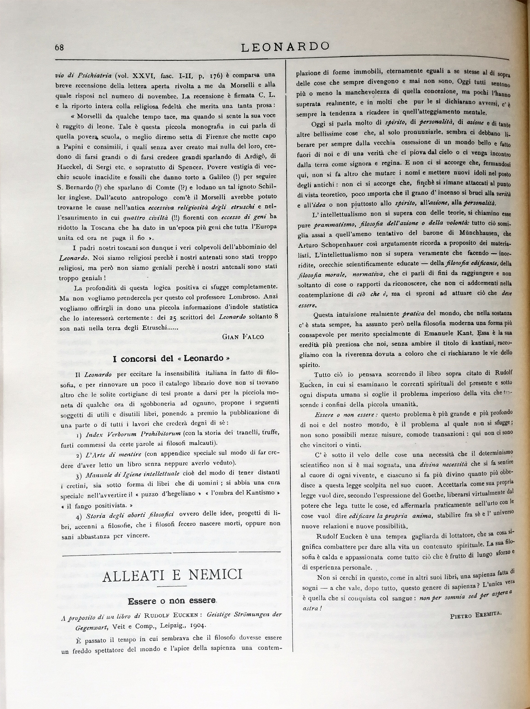 La profondità di questa logica positiva ci sfugge completamente. Ma non vogliamo prendercela per questo col professore Lombroso. Anzi vogliamo offrirgli in dono una piccola informazione d'indole statistica che lo interesserà certamente: dei 25 scrittori del Leonardo soltanto 8 son nati nella terra degli Etruschi.....
