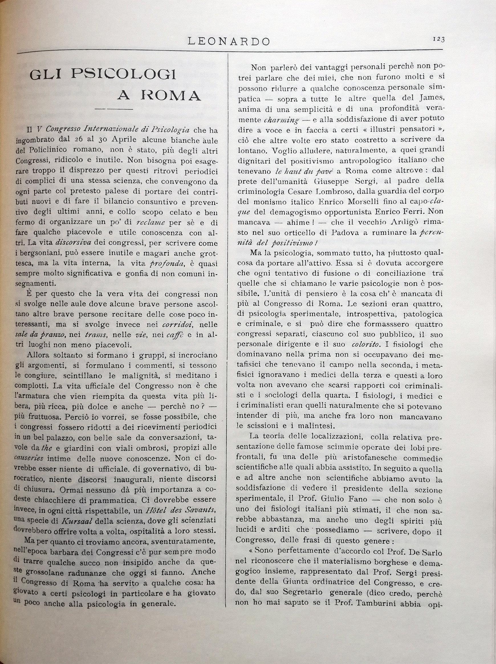Non parlerò dei vantaggi personali perchè non potrei parlare che dei miei, che non furono molti e si possono ridurre a qualche conoscenza personale simpatica — sopra a tutte le altre quella del James, anima di una semplicità e di una profondità veramente charming — e alla soddisfazione di aver potuto dire a voce e in faccia a certi «illustri pensatori», ciò che altre volte ero stato costretto a scrivere da lontano. Voglio alludere, naturalmente, a quei grandi dignitari del positivismo antropologico italiano che tenevano le haut du parvè a Roma come altrove: dal prete dell'umanità Giuseppe Sergi, al padre della criminologia Cesare Lombroso, dalla guardia del corpo del monismo italico Enrico Morselli fino al capo-claque del demagogismo opportunista Enrico Ferri. Non. mancava — ahime! — che il vecchio Ardigò rimasto nel suo orticello di Padova a ruminare la perennità del Positivismo /