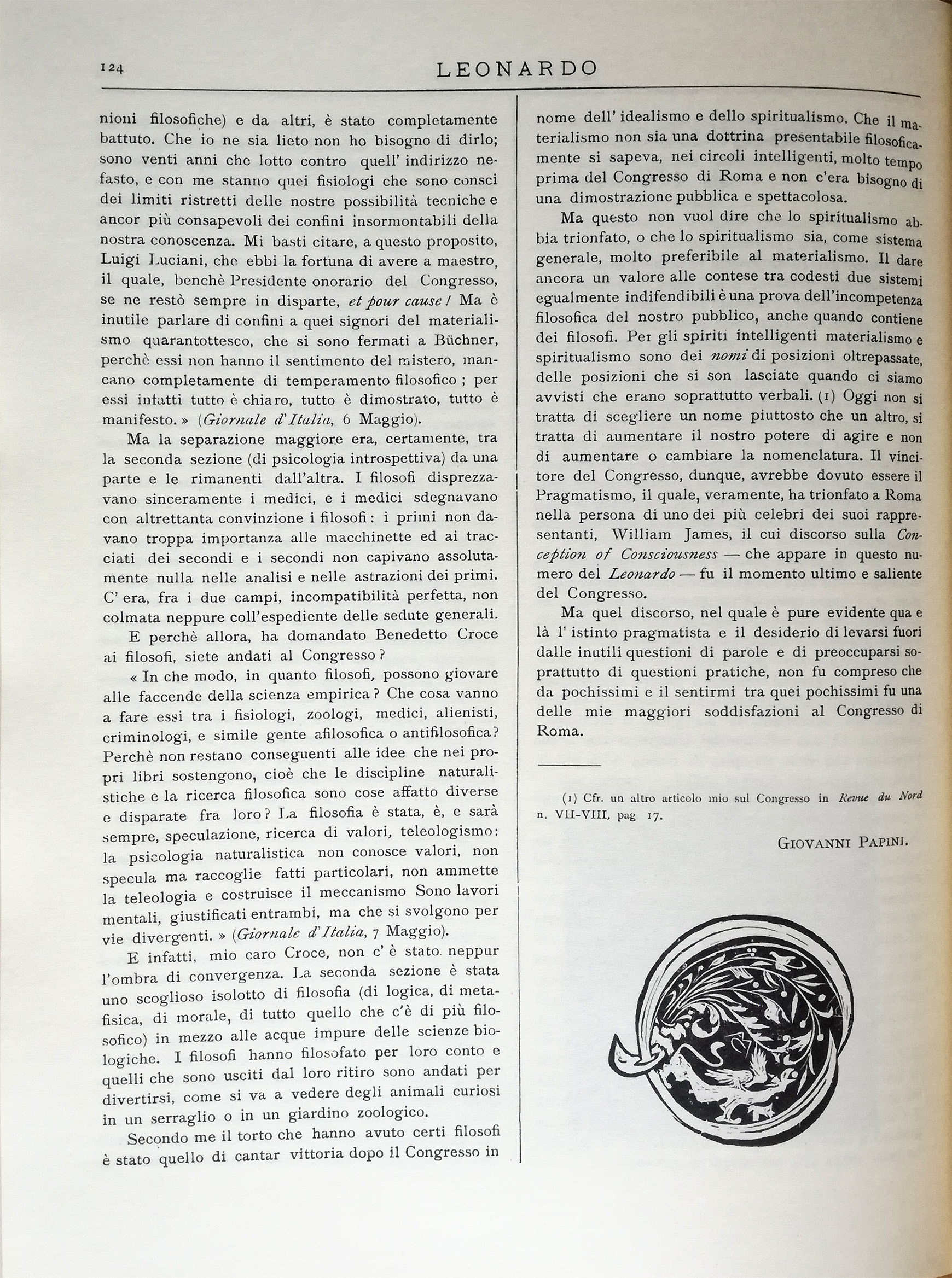 Ma questo non vuol dire che lo spiritualismo abbia trionfato, o che lo spiritualismo sia, come sistema generale, molto preferibile al materialismo. Il dare ancora un valore alle contese tra codesti due sistemi egualmente indifendibili è una prova dell'incompetenza filosofica del nostro pubblico, anche quando contiene dei filosofi. Per gli spiriti intelligenti materialismo e spiritualismo sono dei nomi di posizioni oltrepassate, delle posizioni che si son lasciate quando ci siamo avviati che erano soprattutto verbali. 1 Oggi non si tratta di scegliere un nome piuttosto che un altro, si tratta di aumentare il nostro potere di agire e non di aumentare o cambiare la nomenclatura. Il vincitore del Congresso, dunque, avrebbe dovuto essere il Pragmatismo, il quale, veramente, ha trionfato a Roma nella persona di uno dei più celebri dei suoi rappresentanti, William James, il cui discorso sulla Conception of Consciousness — che appare in questo numero del Leonardo — fu il momento ultimo e saliente del Congresso.