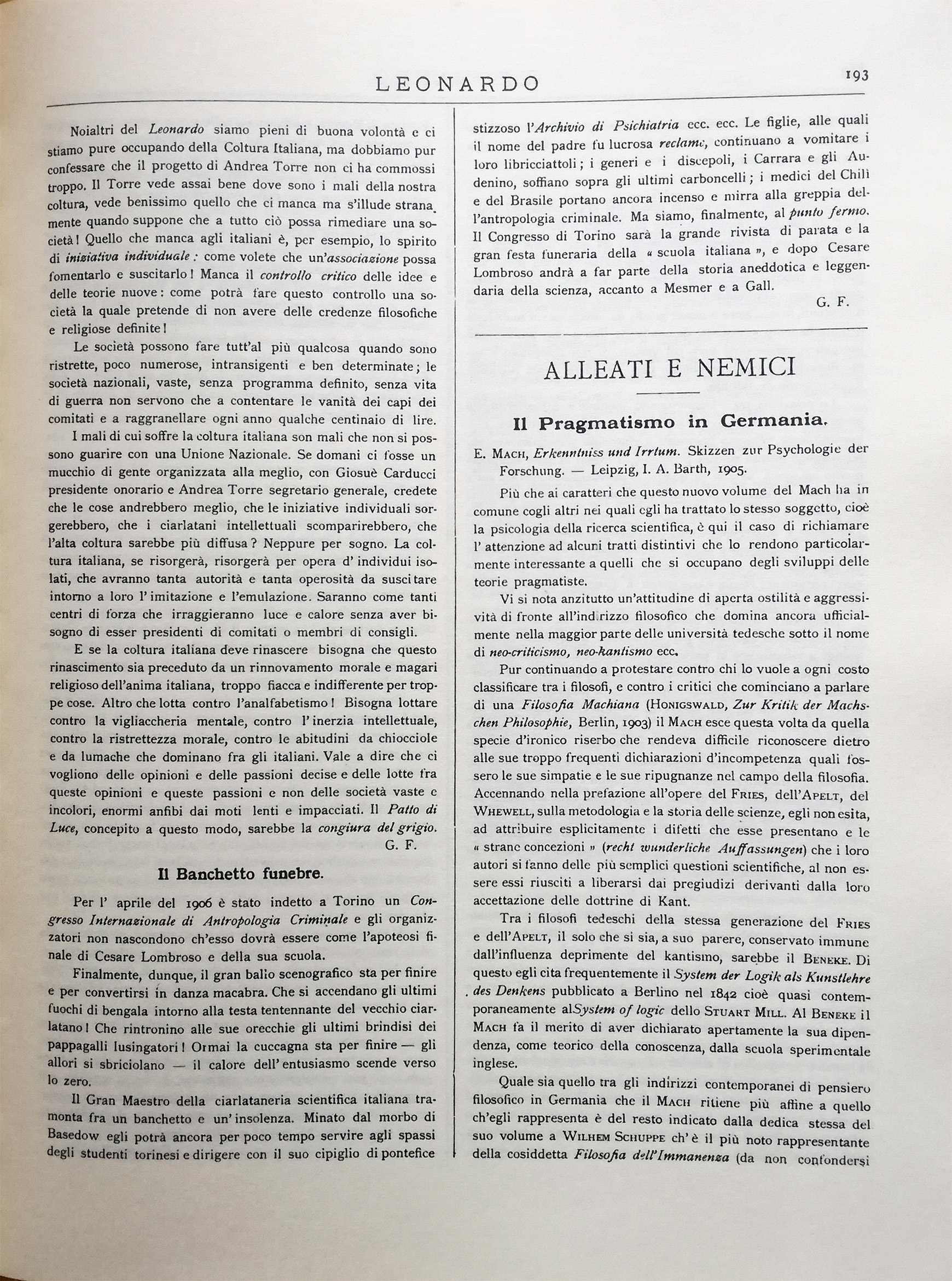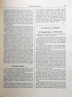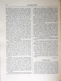 Noialtri del Leonardo siamo pieni di buona volontà e ci stiamo pure occupando della Coltura Italiana, ma dobbiamo pur confessare che il progetto di Andrea Torre non ci ha commossi troppo. Il Torre vede assai bene dove sono i mali della nostra coltura, vede benissimo quello che ci manca ma s'illude stranamente quando suppone che a tutto ciò possa rimediare una società! Quello che manca agli italiani è, per esempio, lo spirito di iniziativa individuale: come volete che un'associazione possa fomentarlo e suscitarlo! Manca il controllo critico delle idee e delle teorie nuove: come potrà fare questo controllo una società la quale pretende di non avere delle credenze filosofiche e religiose definite!