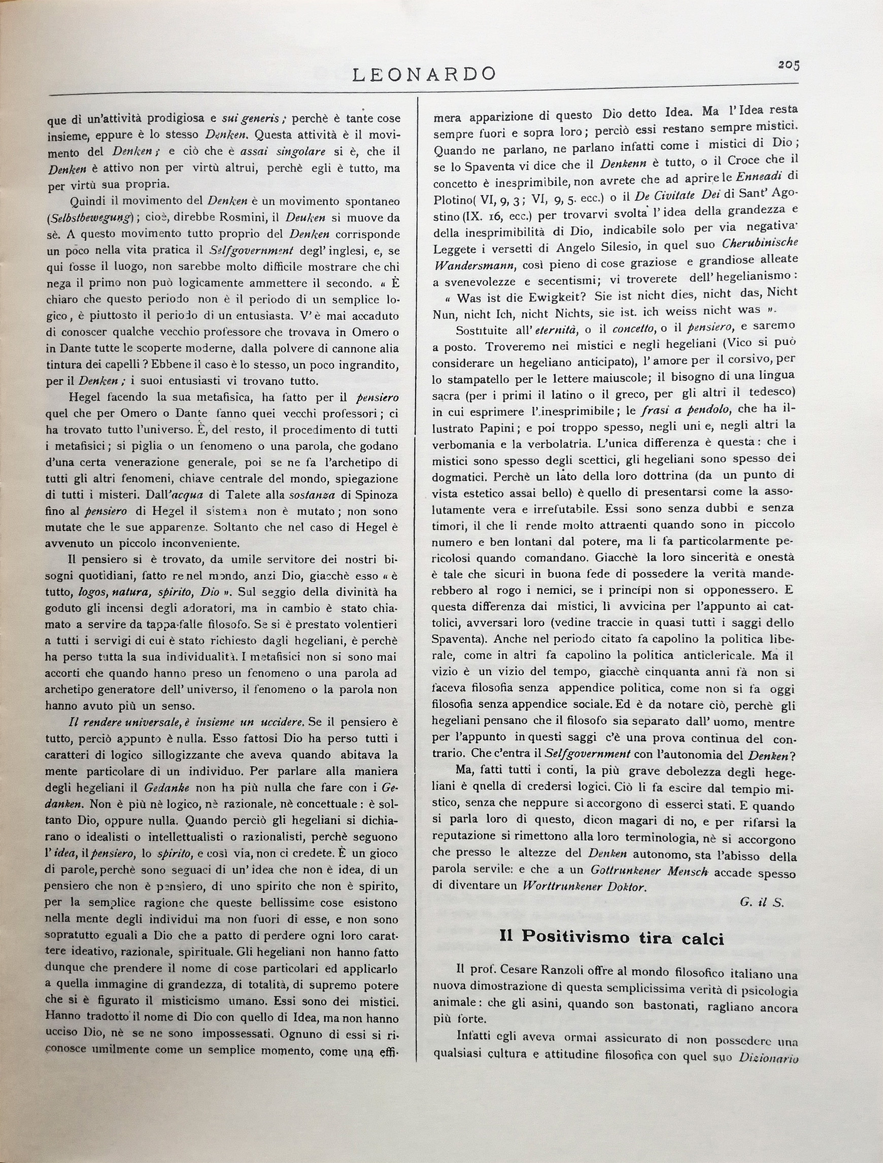 Il prof. Cesare Ranzoli offre al mondo filosofico italiano una nuova dimostrazione di questa semplicissima verità di psicologia animale: che gli asini, quando son bastonati, ragliano ancora più forte.