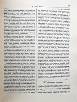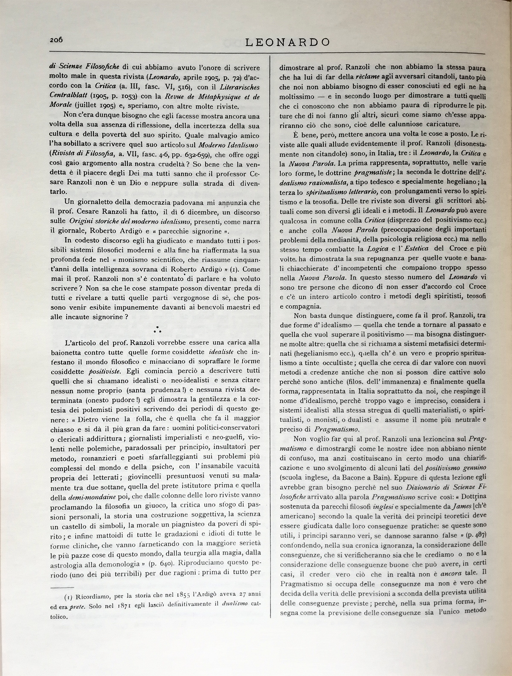 È bene, però, mettere ancora una volta le cose a posto. Le riviste alle quali allude evidentemente il prof. Ranzoli (disonestamente non citandole) sono, in Italia, tre: il Leonardo, la Critica e la Nuova Parola. La prima rappresenta, soprattutto, nelle varie loro forme, le dottrine pragmatiste; la seconda le dottrine dell'idealismo razionalista, a tipo tedesco e specialmente hegeliano; la terza lo spiritualismo letterario, con prolungamenti verso lo spiritismo e la teosofia. Delle tre riviste son diversi gli scrittori abituali come son diversi gli ideali e i metodi. Il Leonardo può avere qualcosa in comune colla Critica (disprezzo del positivismo ecc.) e anche colla Nuova Parola (preoccupazione degli importanti problemi della medianità, della psicologia religiosa ecc.) ma nello stesso tempo combatte la Logica e l'Estetica del Croce e più volte, ha dimostrata la sua repugnanza per quelle vuote e banali chiacchierate d'incompetenti che compaiono troppo spesso nella Nuova Parola. In questo stesso numero del Leonardo vi sono tre persone che dicono di non esser d'accordo col Croce e c'è un intero articolo contro i metodi degli spiritisti, teosofi e compagnia.