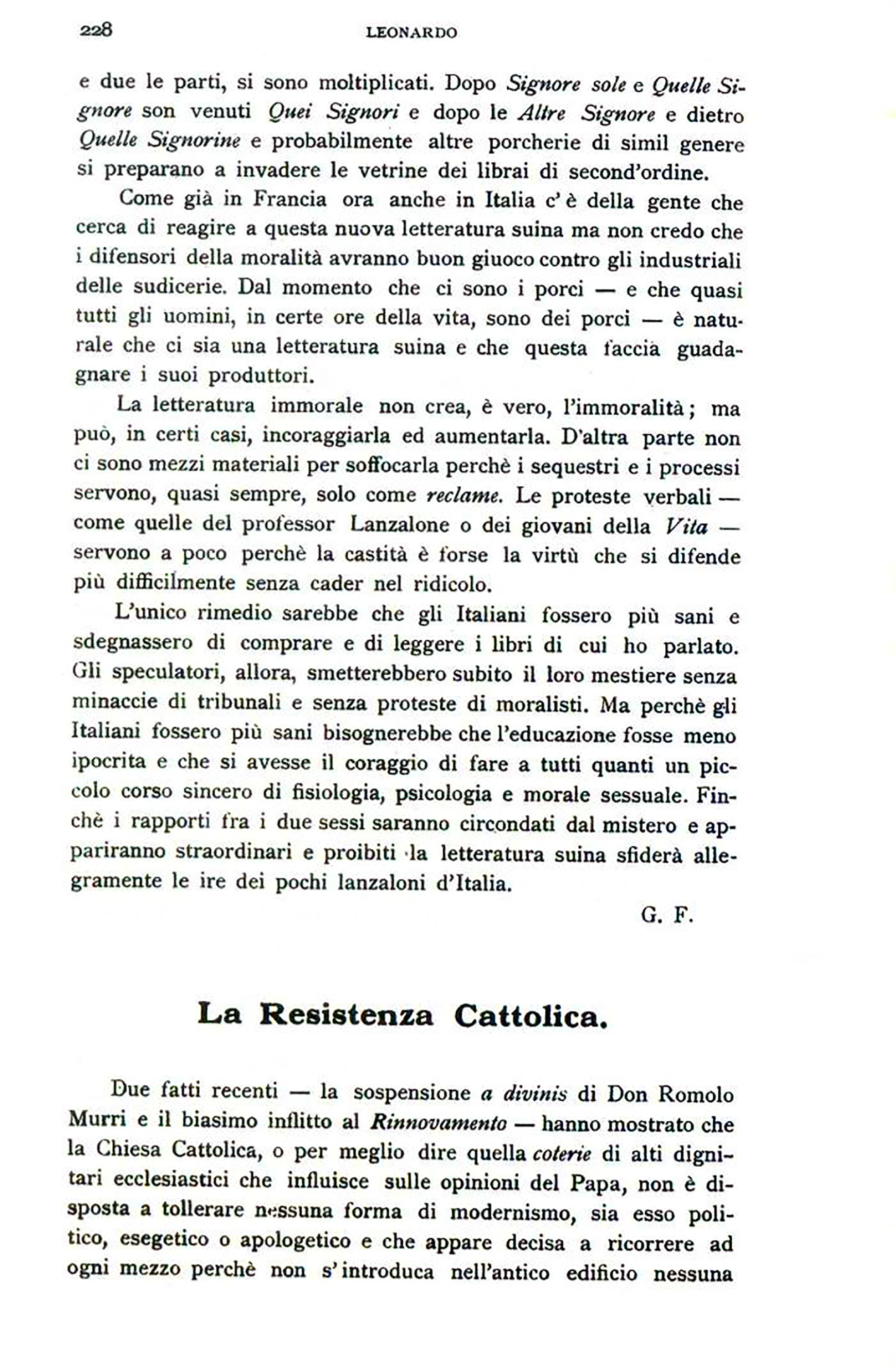 Due fatti recenti — la sospensione a divinis di Don Romolo Murri e il biasimo inflitto al Rinnovamento — hanno mostrato che la Chiesa Cattolica, o per meglio dire quella coterie di alti dignitari ecclesiastici che influisce sulle opinioni del Papa, non è disposta a tollerare nessuna forma di modernismo, sia esso politico, esegetico o apologetico e che appare decisa a ricorrere ad ogni mezzo perchè non s'introduca nell'antico edificio nessuna
