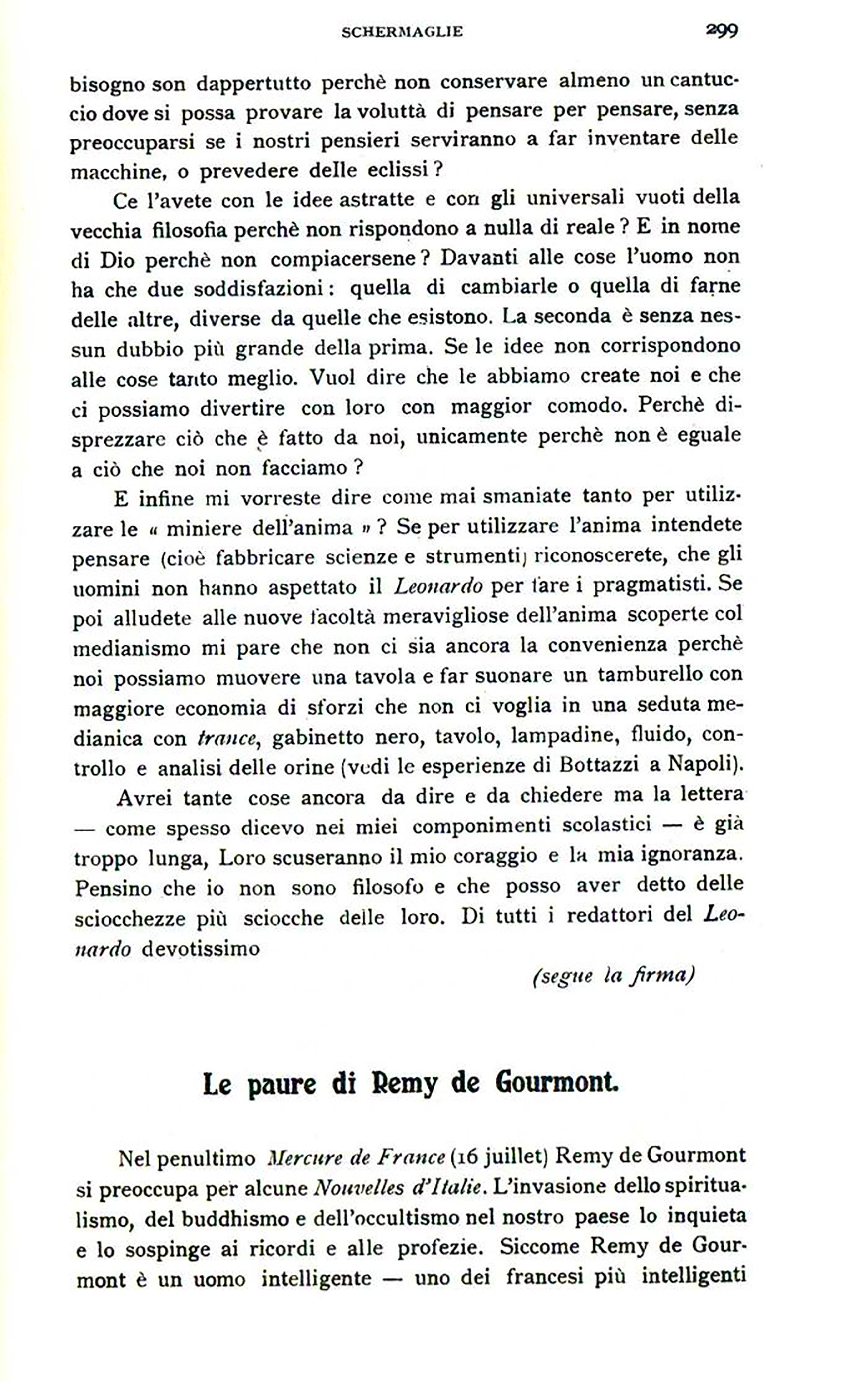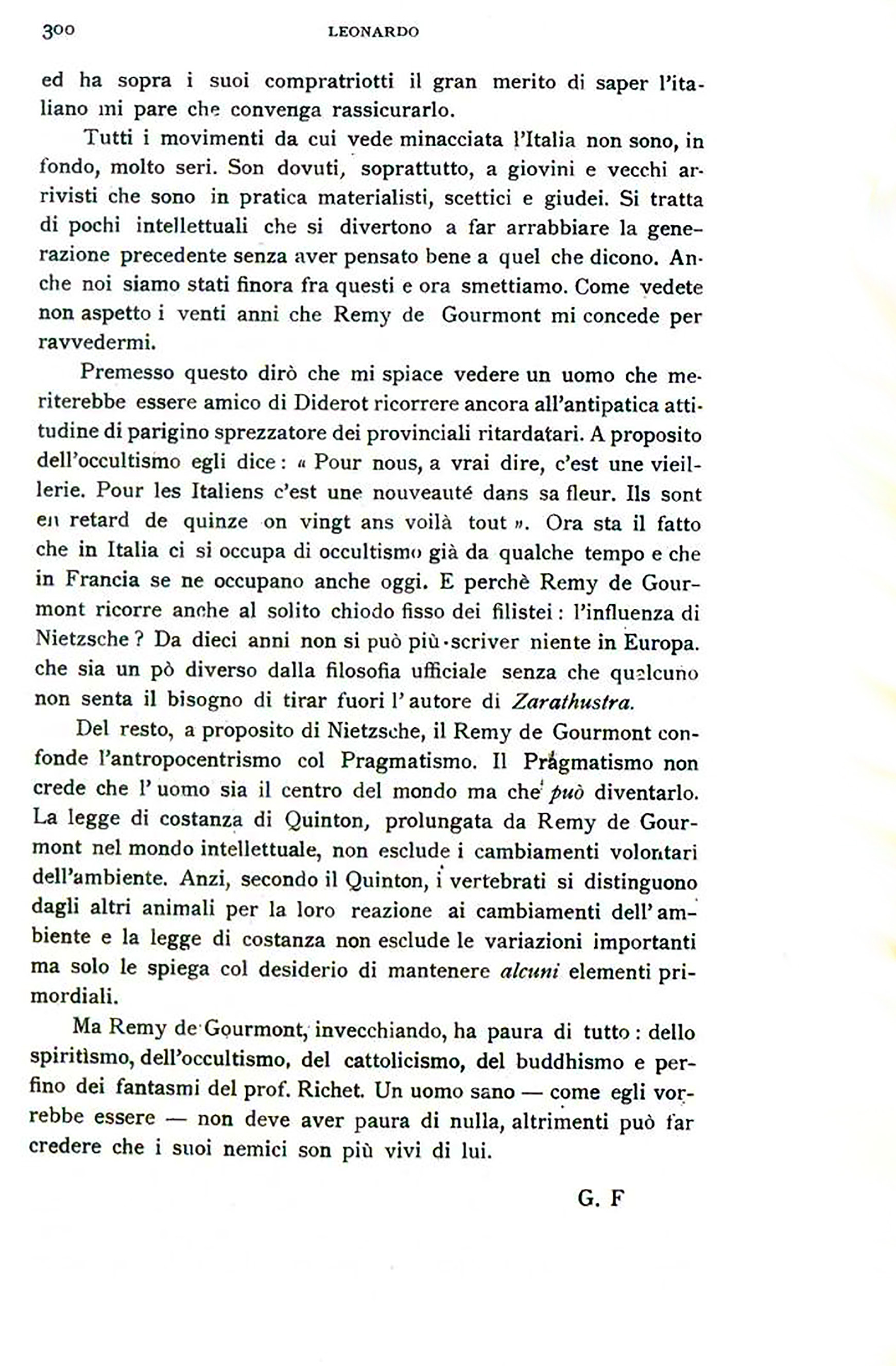 Premesso questo dirò che mi spiace vedere un uomo che meriterebbe essere amico di Diderot ricorrere ancora all'antipatica attitudine di parigino sprezzatore dei provinciali ritardatari. A proposito dell'occultismo egli dice: «Pour nous, a vrai dire, c'est une vieillerie. Pour les Italiens c'est une nouveauté dans sa fleur. Ils sont en retard de quinze on vingt ans voilà tout». Ora sta il fatto che in Italia ci si occupa di occultismo già da qualche tempo e che in Francia se ne occupano anche oggi. E perchè Remy de Gourmont ricorre anche al solito chiodo fisso dei filistei: l'influenza di Nietzsche? Da dieci anni non si può più scriver niente in Europa, che sia un pò diverso dalla filosofia ufficiale senza che qualcuno non senta il bisogno di tirar fuori l'autore di Zarathustra.