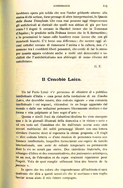 Un tal Furio Lenzi s'è permesso di chiedere al «pubblico intellettuale d'Italia» cosa pensi della fondazione di un Cenobio Laico, che dovrebbe essere, dice codesto signore «una comunità intellettuale i cui seguaci, ritirandosi in un luogo appartato dal mondo e dalle sue seduzioni potessero liberamente studiare e dar forma e vita palpitante ai loro sogni d'arte».