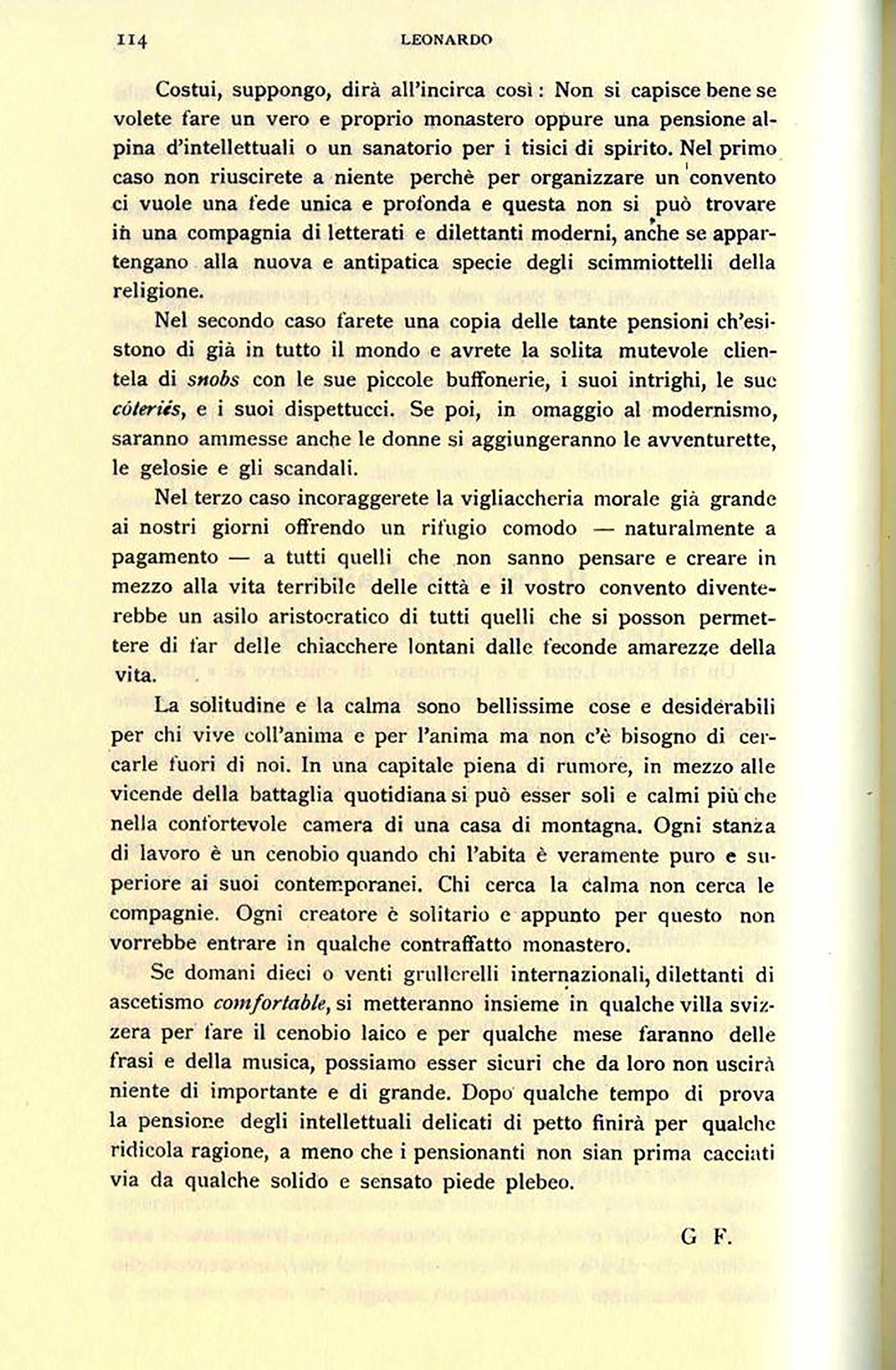 Se domani dieci o venti grullereHi internazionali, dilettanti di ascetismo comfortable, si metteranno insieme in qualche villa svizzera per fare il cenobio laico e per qualche mese faranno delle frasi e della musica, possiamo esser sicuri che da loro non uscirà niente di importante e di grande. Dopo qualche tempo di prova la pensione degli intellettuali delicati di petto finirà per qualche ridicola ragione, a meno che i pensionanti non sian prima cacciati via da qualche solido e sensato piede plebeo.