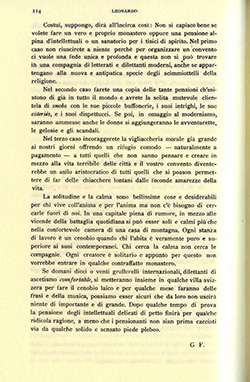 La solitudine e la calma sono bellissime cose e desiderabili per chi vive coll'anima e per l'anima ma non c'è bisogno di cercarle fuori di noi. In una capitale piena di rumore, in mezzo alle vicende della battaglia quotidiana si può esser soli e calmi più che nella confortevole camera di una casa di montagna. Ogni stanza di lavoro è un cenobio quando chi l'abita è veramente puro e superiore ai suoi contemporanei. Chi cerca la calma non cerca le compagnie. Ogni creatore è solitario e appunto per questo non vorrebbe entrare in qualche contraffatto monastero.