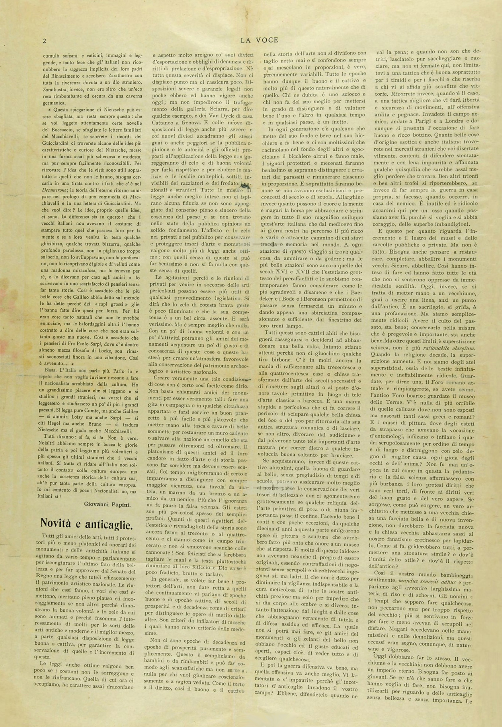 Basta. L'Italia non parla più. Parlo io e ripeto che non voglio invitare nessuno a fare il nazionalista arrabbiato della cultura. Ho un grandissimo piacere che si leggano e si studino i grandi stranieri, ma vorrei che si leggessero e studiassero un po' di più i grandi paesani. Si legga pure Comte, ma anche Galileo — si ammiri Loisy ma anche Sarpi — si citi Hegel ma anche Bruno — si traduca Nietzsche ma si goda anche Macchiavelli. Tutti diranno si fa, si fa. Non è vero. Noialtri abbiamo sempre in bocca le glorie della patria e poi leggiamo più volentieri e più spesso gli ultimi stranieri che i vecchi italiani. Si tratta di ridare all'Italia non soltanto il contatto colla cultura europea ma anche la coscienza storica della cultura sua, ch'è pur tanta parte della cultura europea. Io mi contento di poco: Nazionalisti no, ma Italiani si!