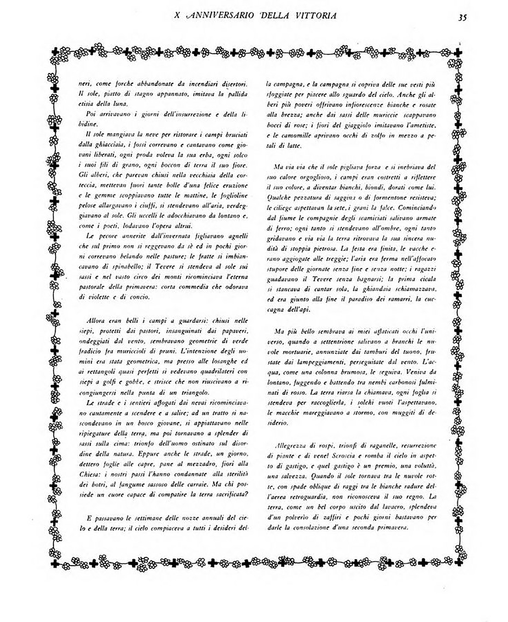 Intorno, nel sodo, i fiori non seminati l'odorano nelle stagioni feconde; vi salgono le pavoline, vi prendono il sole le lucertole, le farfalle vi si accoppiano. Le formiche hanno fatto del basamento un granaio; per i serpi è una terrazza; per gli innamorati della domenica un ritrovo onesto; per la Madonna di maggio e per la Madonna di settembre tutto il popolo viene quassù con i preti vestiti di seta bianca, gli uomini della compagnia con le mantelline vinate, le ragazze col velo bianco e tutti si inginocchiano e il sole di primavera e di autunno fa da raggiera al Santissimo.