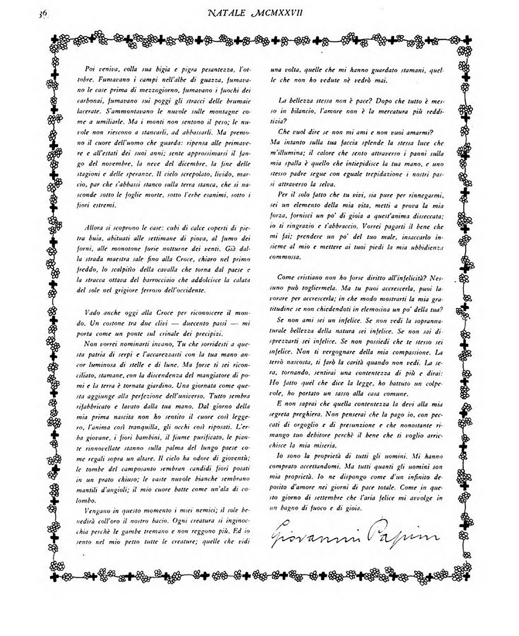 Tutta la valle, da quella punta protesa, era mia. Le montagne mi salvavano a levante dall'Adriatico, a tramontana dalla Romagna, a mezzogiorno dall'Umbria. Camminando un po' alla mia sinistra avrei bevuto alla prima polla del Tevere e mi sarei trovato nei pressi dei tre poggi repubblicani; camminando dinanzi a me avrei avvistati i barconi che portano il sole pitturato sulla vela per i giorni di buriana; viaggiando a destra avrei rifatto il cammino di S. Francesco quando mosse alla Verno per tornare alla patria e alla tomba. Ma tutte queste tentazioni non mi tentavano; appollaiato su quel sasso toscano, in questo estremo biscanto della mia terra, mi rassegnavo alla meditazione, combattevo con le mie voglie, mi rifornivo d'aria corrente. Quante ore della mia vita ho passato all'ombra della mia croce! Di lassù ho visto la terra in tutti i suoi costumi: certi giorni le montagne sparivano, un vapore d'umido silenzio colmava la valle, una muraglia di nebbia nera chiudeva ogni passo: rimanevo solo con la croce, io solo nel mondo, come l'ultimo uomo scampato a un nuovo diluvio avviticchiato all'albero nero, sull'ultimo scoglio emerso dal nulla: solo sopra un infinito mare di fumo e di cenere, a tu per tu col Crocifisso.