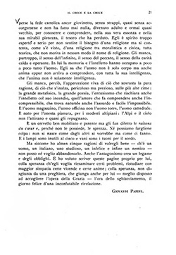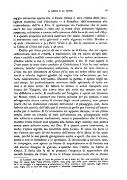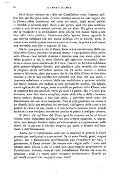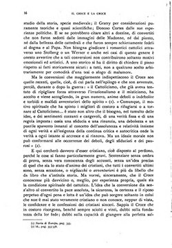 Debbo per forza parlar di me e anche se il Croce, che mi reputa esibizionista, non ci crederà, a malincuore. Ma tra coloro ch'egli definisce «torbidi e malfidi avventurieri dello spirito» ha voluto certamente alludere anche a me e, forse, principalmente a me. E vuol sapere il Croce come io sono stato condotto al Cattolicismo? Non ho mai voluto scrivere, benché ripetutamente sollecitato, la storia del mio ritorno a Cristo ma per dimostrare al Croce ch'io non mi sento offeso dai suoi acerbi e talvolta ingiusti giudizi 18