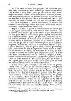 Ma ci son offese alla verità assai più gravi. Nel capitolo IV (Vittoria contro l'assolutismo) il Croce accenna agli scrittori di quel tempo e del Manzoni si sbriga così: «esso e gli altri della sua scuola appartengono alla cerchia liberate e non a quella cattolica o clericale, la quale, come non produsse pensatori o li produsse eterodossi o poco ortodossi, così non ebbe in Italia poeti ne scrittori di qualche conto» 7.
