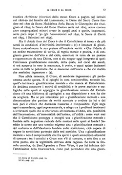 E difatti c'è nel libro del Croce qualche accenno anche al Cattolicismo come organismo spirituale ma non sempre equanime e, soprattutto, non sempre fondato sopra un'informazione e comprensione sufficienti. Se là parlava il liberale inagrito qui parla il filosofo dell'idealismo e dell'immanenza.