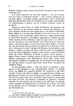 E come potrebbe l'amore — fuoco di carità e di sacrificio — presentare in bei sillogismi la sua «giustificazione mentale» al filosofo Croce, che diffida, per congenita gelidità, del sentimento e dei sentimentali? L'amore può offrir di meglio: una giustificazione storica, una giustificazione umana che dura da diciannove secoli: i mutamenti morali da esso portati nella vita e nell'anime degli uomini, la storia delle sue opere di carità, così malnote ai pensatori di gabinetto; l'esercito immenso dei suoi apostoli, dei suoi martiri, dei suoi beati. La giustificazione massima del Cattolicismo è in un'opera che il Croce, con tutta la sua dottrina, non ha l'abitudine di leggere: negli 4cta Sanctorum dei Bollandisti 12.