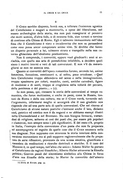 L'intenzione mia non è, ora, di scandagliare questi e simili problemi si bene di giudicare i giudizi del Croce intorno alla religione e al Cattolicismo e in particolar modo intorno al significato dei ritorni alla fede cattolica. Che nel suo libro egli si dimostra se non avversario radicale della religione — purchè questa sia intesa a suo modo — non certo amico del Cristianesimo e sopratutto di quell'autentico e totale Cristianesimo ch'e la sostanza viva della Chiesa di Roma.