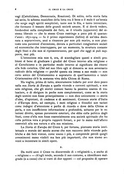 Da molti anni mi ero astenuto dal discorrer pubblicamente intorno a Benedetto Croce e anche questa volta, per dir la verità, ne avrei fatto volentieri a meno, se alcune cose da lui affermate in questo libro non avessero profondamente ferito — oltre che la verità storica — la mia coscienza di uomo e di cristiano. Può darsi che in anni lontani io sia stato ingiusto verso di lui, almen nell'espressione dei miei dissensi, trasportato dalla galloria giovanile e, se questo fosse, ne faccio qui pubblica ammenda e gli chiedo candidamente perdono 19.