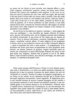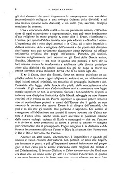 un uomo che sia ridotto al puro cervello, non risponde affatto a tutte l'altre esigenze, sentimentali, poetiche, umane nel pieno senso (filiali, fraterne) che l'uomo vuol soddisfare nelle religioni. A chi cerca un albero con tutta la ricchezza dei suoi rami, delle sue foglie, dei suoi fiori e dei suoi frutti il Croce offre un tronco nudo e piallato, tolto dal caldo humus della terra madre e a chi desidera una foresta, colle sue ombre e i suoi nidi, le sue luci e le sue calde radure, presenta un filare di manichi da granata. Se il Croce preferisce un palo astratto a una bella quercia faccia pure: contento lui contento nessuno. Ma sappia e si ricordi che l'uomo cerca nella religione un tempio completo e non soltanto un pensatoio o una cattedra.