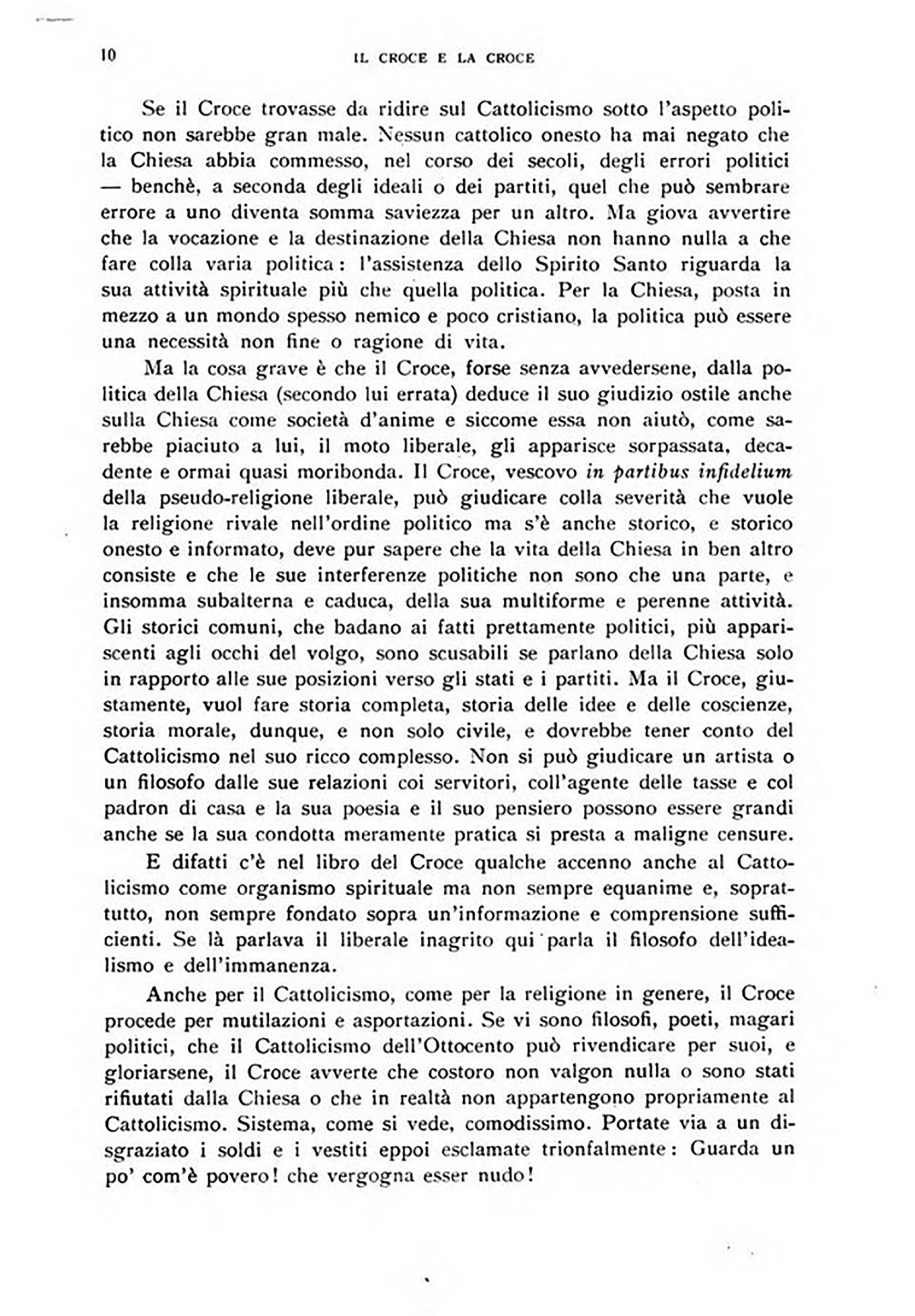 Il Croce sarebbe disposto, bontà sua, a tollerare l'esistenza agonica del Cattolicismo e magari a mantenerlo, a spese del liberalismo, nel museo archeologico della storia, ma non può rassegnarsi al pensiero che molti uomini, d'altra fede, o di nessuna fede, sian tornati o tornino di continuo alla Chiesa di Roma. Egli è talmente immassimato nell'idea fissa che il Cattolicismo è vieto e incadaverito che non sa persuadersi come esso possa ancor conquistare anime vive. Si direbbe che fanno un dispetto personale a lui, talmente sicuro e tranquillo nella sua caverna ghiacciata dell'idealismo postkantiano.