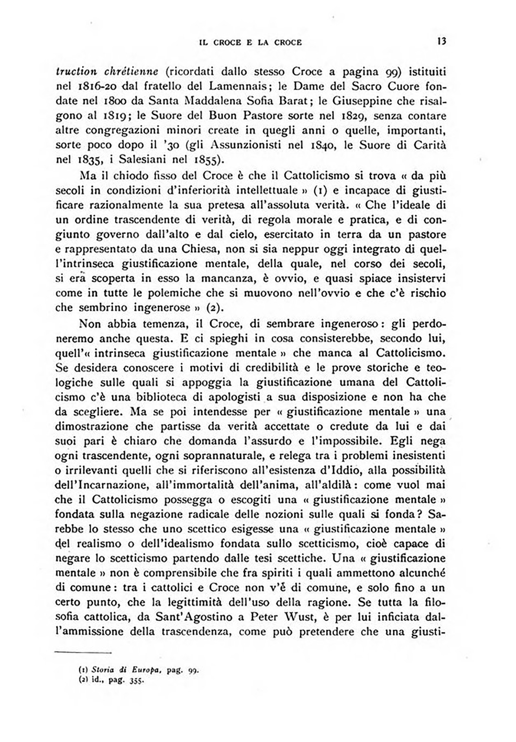E difatti c'è nel libro del Croce qualche accenno anche al Cattolicismo come organismo spirituale ma non sempre equanime e, soprattutto, non sempre fondato sopra un'informazione e comprensione sufficienti. Se là parlava il liberale inagrito qui parla il filosofo dell'idealismo e dell'immanenza.