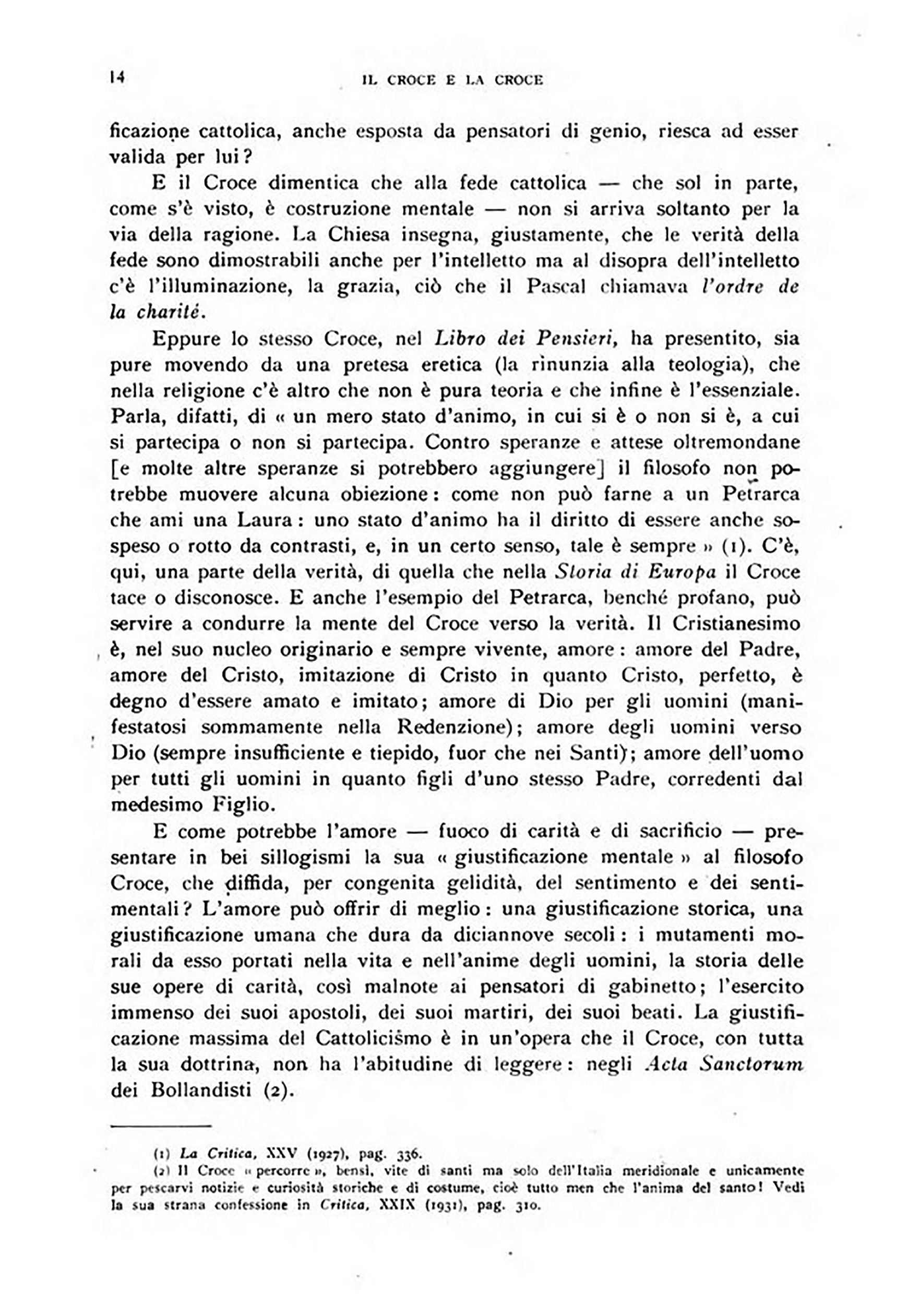 E come potrebbe l'amore — fuoco di carità e di sacrificio — presentare in bei sillogismi la sua «giustificazione mentale» al filosofo Croce, che diffida, per congenita gelidità, del sentimento e dei sentimentali? L'amore può offrir di meglio: una giustificazione storica, una giustificazione umana che dura da diciannove secoli: i mutamenti morali da esso portati nella vita e nell'anime degli uomini, la storia delle sue opere di carità, così malnote ai pensatori di gabinetto; l'esercito immenso dei suoi apostoli, dei suoi martiri, dei suoi beati. La giustificazione massima del Cattolicismo è in un'opera che il Croce, con tutta la sua dottrina, non ha l'abitudine di leggere: negli 4cta Sanctorum dei Bollandisti 12.