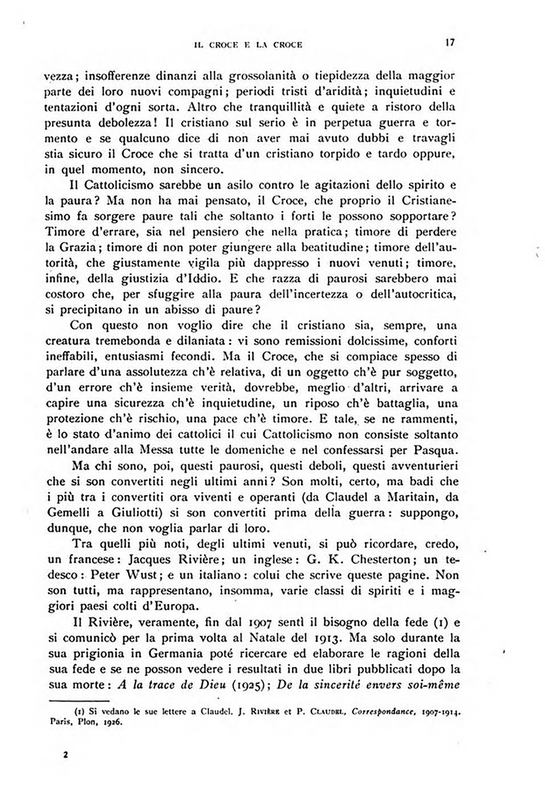 (1925). È difficile trovare uno spirito più fine, autocritico e leale di quello del Rivière: sottile, inquieto, severo verso sé stesso, entusiasta e nello stesso tempo guardingo e sorvegliato: cervello d'intellettuale ardente e cuore d'artista. Si leggano le sue lettere e i suoi libri: non v'è traccia alcuna di quella paura, di quella debolezza, di quell'aspirazione a una requie vile che secondo il Croce sono i maggiori moventi d'una conversione.