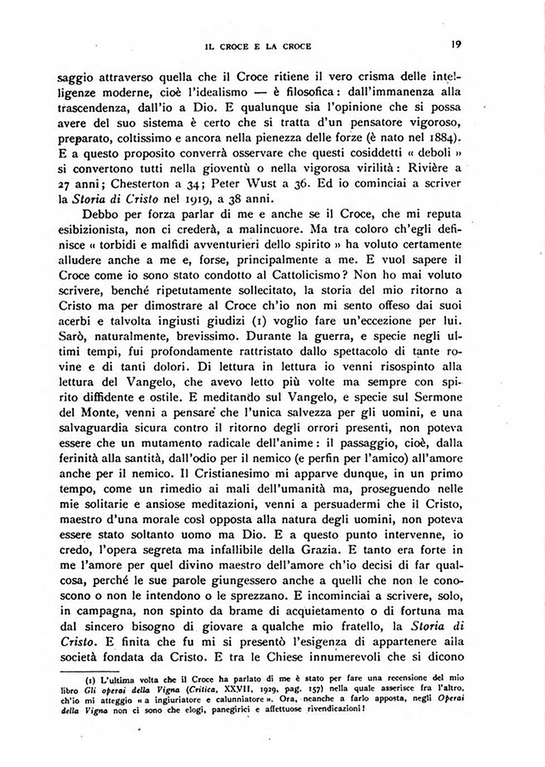 Debbo per forza parlar di me e anche se il Croce, che mi reputa esibizionista, non ci crederà, a malincuore. Ma tra coloro ch'egli definisce «torbidi e malfidi avventurieri dello spirito» ha voluto certamente alludere anche a me e, forse, principalmente a me. E vuol sapere il Croce come io sono stato condotto al Cattolicismo? Non ho mai voluto scrivere, benché ripetutamente sollecitato, la storia del mio ritorno a Cristo ma per dimostrare al Croce ch'io non mi sento offeso dai suoi acerbi e talvolta ingiusti giudizi 18