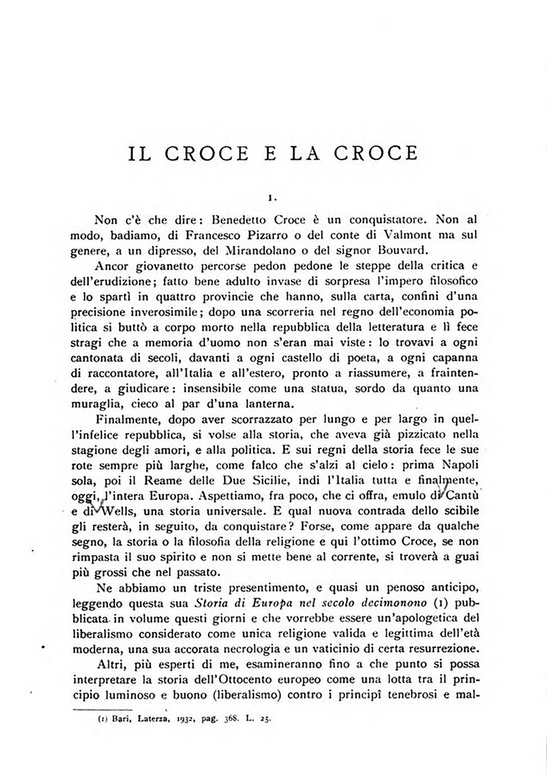 La Storia di Europa del Croce è, per fortuna, piuttosto storia intellettuale e morale del secolo scorso che non racconto delle vicende pubbliche e dei fatti vistosi, come usano i più, e comprende perciò quegli avvenimenti meno visibili ma ben più importanti, che non siamo avvezzi a incontrare in simili opere.