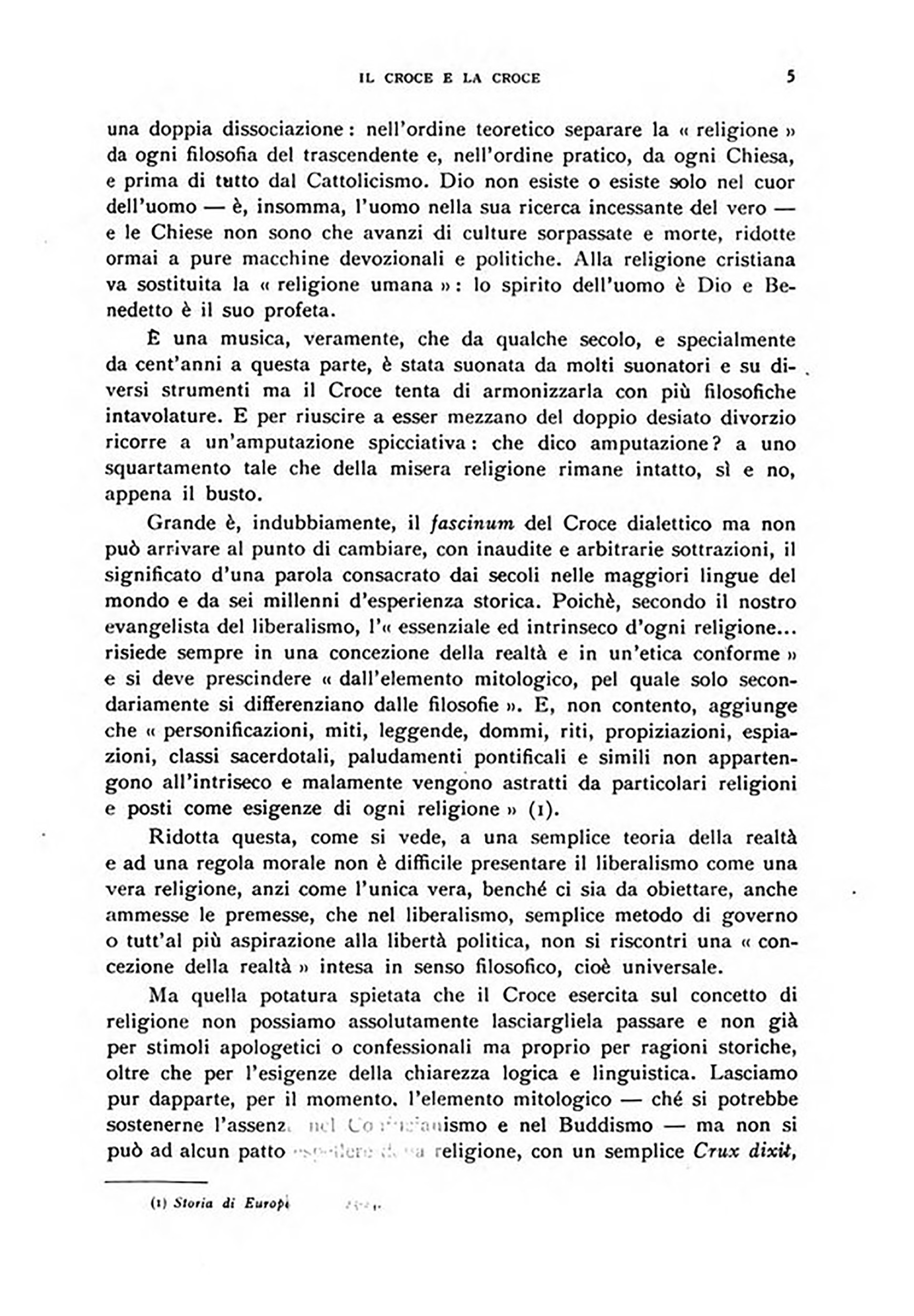 L'intenzione mia non è, ora, di scandagliare questi e simili problemi si bene di giudicare i giudizi del Croce intorno alla religione e al Cattolicismo e in particolar modo intorno al significato dei ritorni alla fede cattolica. Che nel suo libro egli si dimostra se non avversario radicale della religione — purchè questa sia intesa a suo modo — non certo amico del Cristianesimo e sopratutto di quell'autentico e totale Cristianesimo ch'e la sostanza viva della Chiesa di Roma.