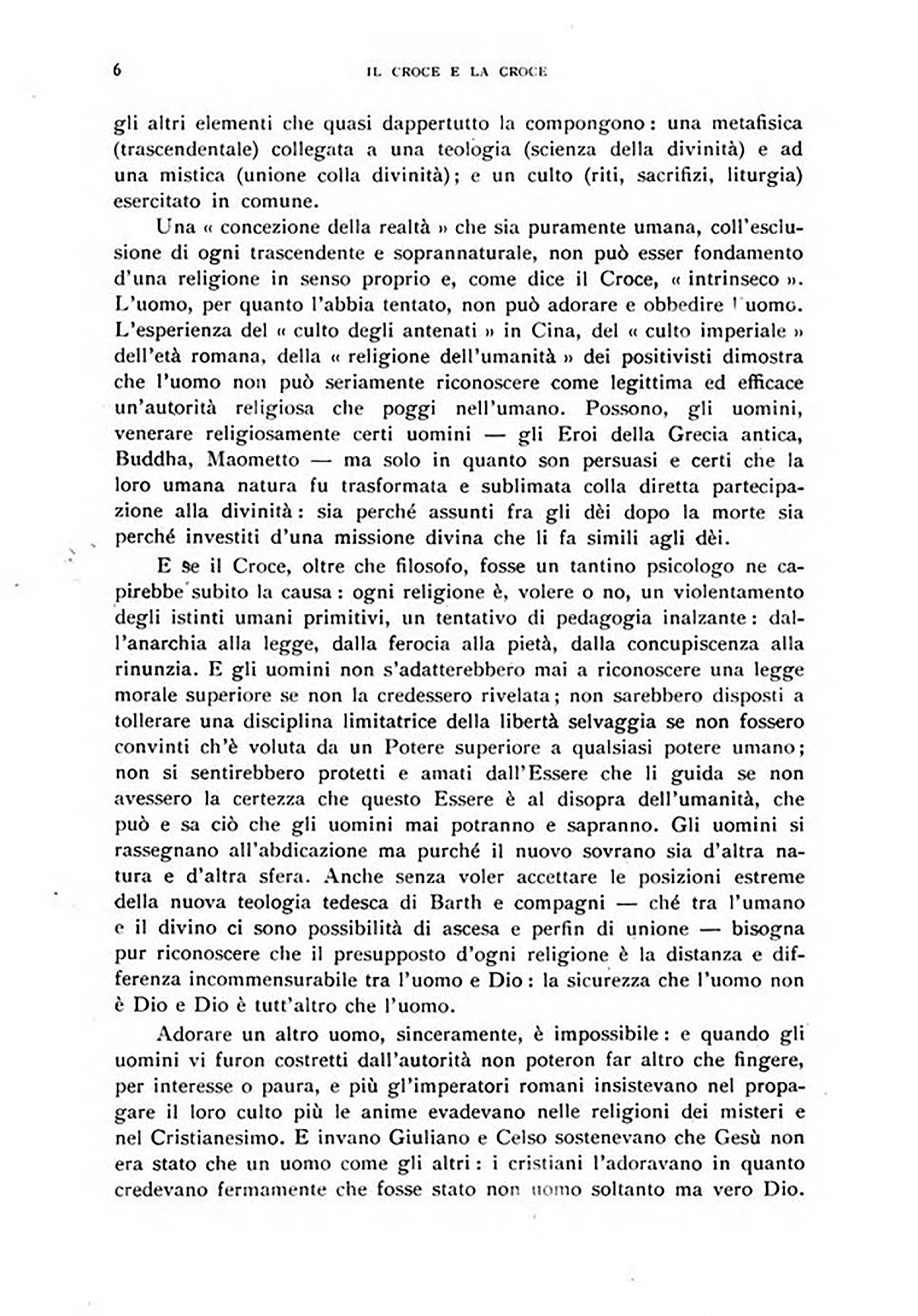 Ma quella potatura spietata che il Croce esercita sul concetto di religione non possiamo assolutamente lasciargliela passare e non già per stimoli apologetici o confessionali ma proprio per ragioni storiche, oltre che per l'esigenze della chiarezza logica e linguistica. Lasciamo pur dapparte, per il momento. l'elemento mitologico — chè si potrebbe sostenerne l'assenza nel Confucianismo e nel Buddismo — ma non si può ad alcun patto espellere dalla religione, con un semplice Crux dixit,