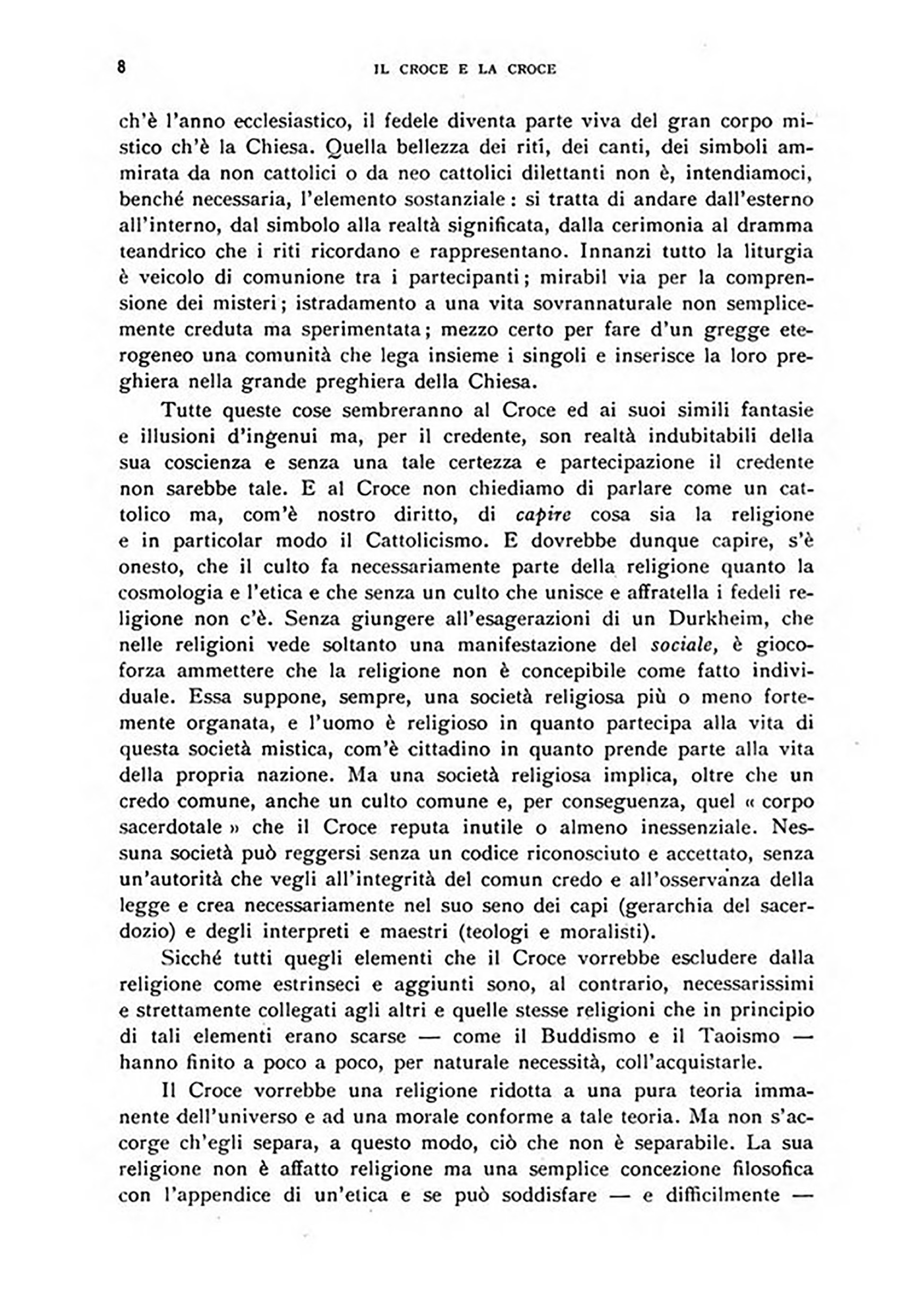 Tutte queste cose sembreranno al Croce ed ai suoi simili fantasie e illusioni d'ingenui ma, per il credente, son realtà indubitabili della sua coscienza e senza una tale certezza e partecipazione il credente non sarebbe tale. E al Croce non chiediamo di parlare come un cattolico ma, come nostro diritto, di capire cosa sia la religione e in particolar modo il Cattolicismo. E dovrebbe dunque capire, s'è onesto, che il culto fa necessariamente parte della religione quanto la cosmologia e l'etica e che senza un culto che unisce e affratella i fedeli religione non c'è. Senza giungere all'esagerazioni di un Durkheim, che nelle religioni vede soltanto una manifestazione del sociale, e gioco-forza ammettere che la religione non è concepibile come fatto individuale. Essa suppone, sempre, una società religiosa più o meno fortemente organata, e l'uomo è religioso in quanto partecipa alla vita di questa società mistica, com'è cittadino in quanto prende parte alla vita della propria nazione. Ma una società religiosa implica, oltre che un credo comune, anche un culto comune e, per conseguenza, quel «corpo sacerdotale» che il Croce reputa inutile o almeno inessenziale. Nessuna società può reggersi senza un codice riconosciuto e accettato, senza un'autorità che vegli all'integrità del comun credo e all'osservanza della legge e crea necessariamente nel suo seno dei capi (gerarchia del sacerdozio) e degli interpreti e maestri (teologi e moralisti).