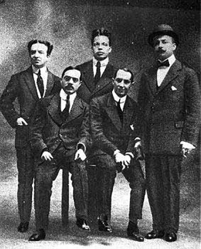 Da sinistra Aldo Palazzeschi, Carlo Carrà, Giovanni Papini, Umberto Boccioni, Filippo Tommaso Marinetti