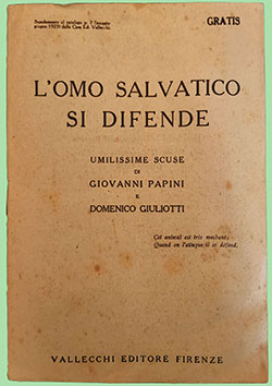| Note: | Opuscolo gratuito allegato al catalogo della Casa Editoriale Vallecchi di maggio - giugno 1923, riproducente la lettera scritta da Giuliotti e Papini indirizzata alla Direzione della rivista "Il Carroccio" di Milano in data aprile 1923 come risposta alle critiche ricevute da parte di cattolici praticanti dopo aver letto il libro "Dizionario dell'Omo salvatico" scritto appunto da Giuliotti e Papini. |